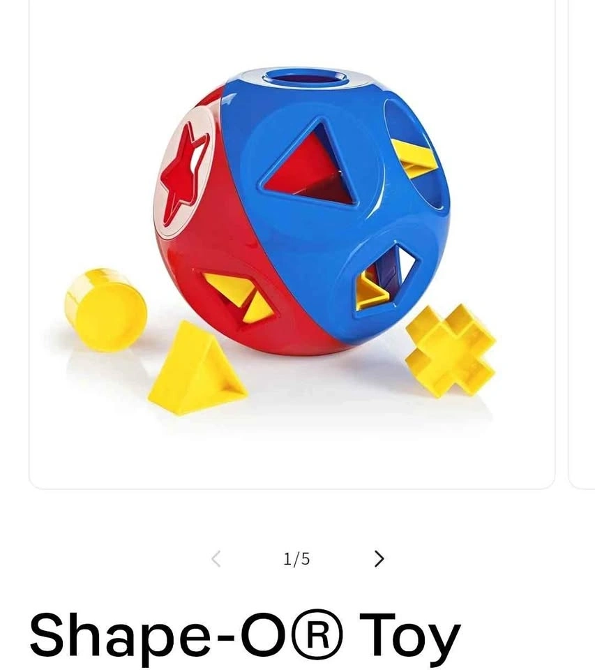 Colorful Shape-O® Toy shape sorter ball. Has the red and blue ball with yellow shapes. Comes with cylinder, triangle, and cross shapes. Great for toddlers learning shapes and developing motor skills.
