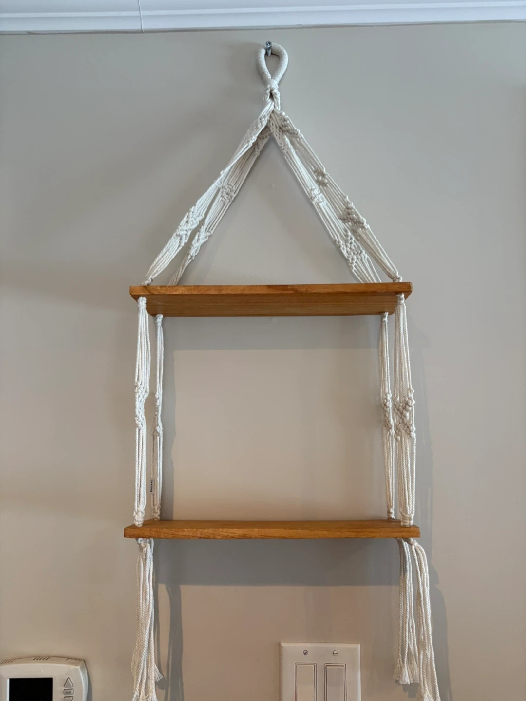 This macrame shelf features two wooden tiers suspended by a white rope hanger. It's perfect for displaying plants or small decor items. The approximate shelf width is 16 inches.