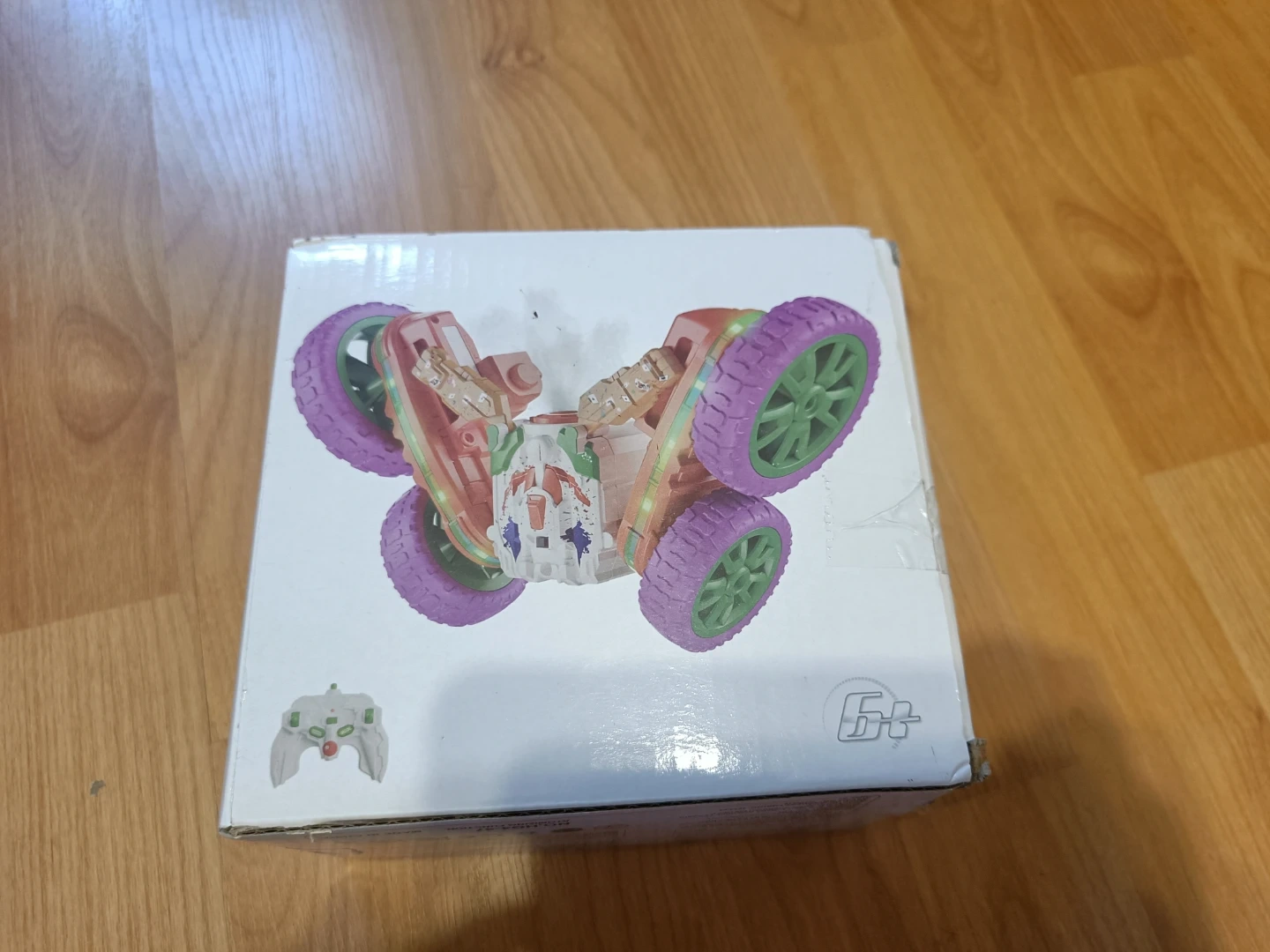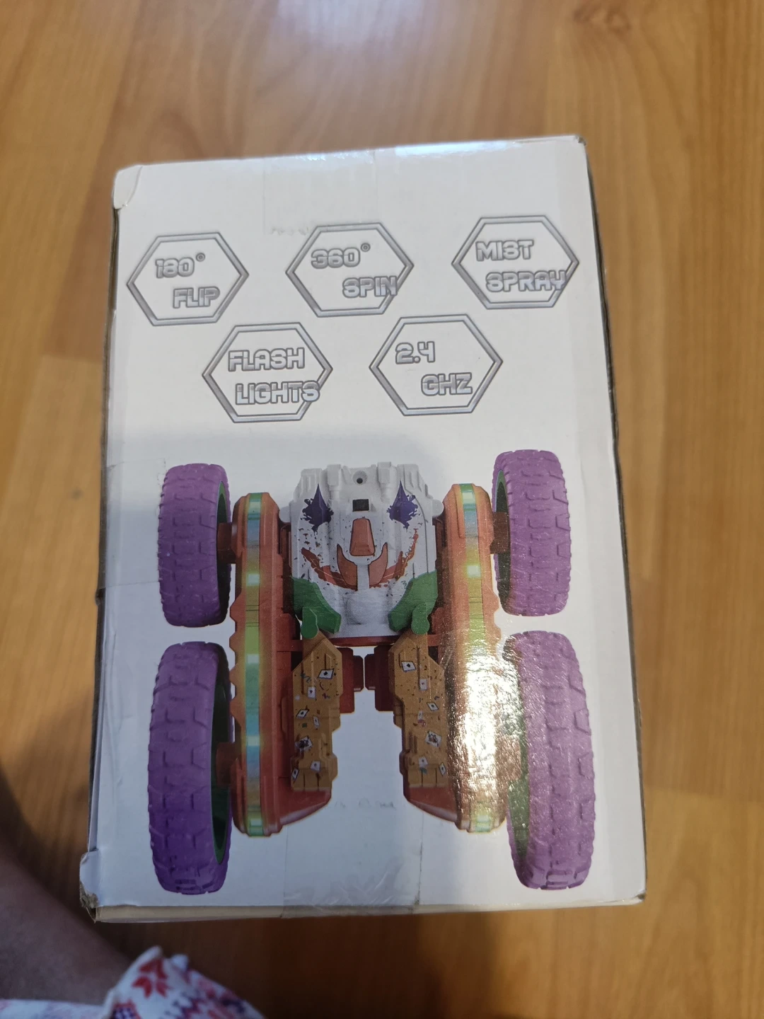 This remote control stunt car features 180-degree flips, 360-degree spins, mist spray, and flashing lights. It operates on a 2.4 GHz frequency and is recommended for ages 6 and up. It comes with a remote control.
