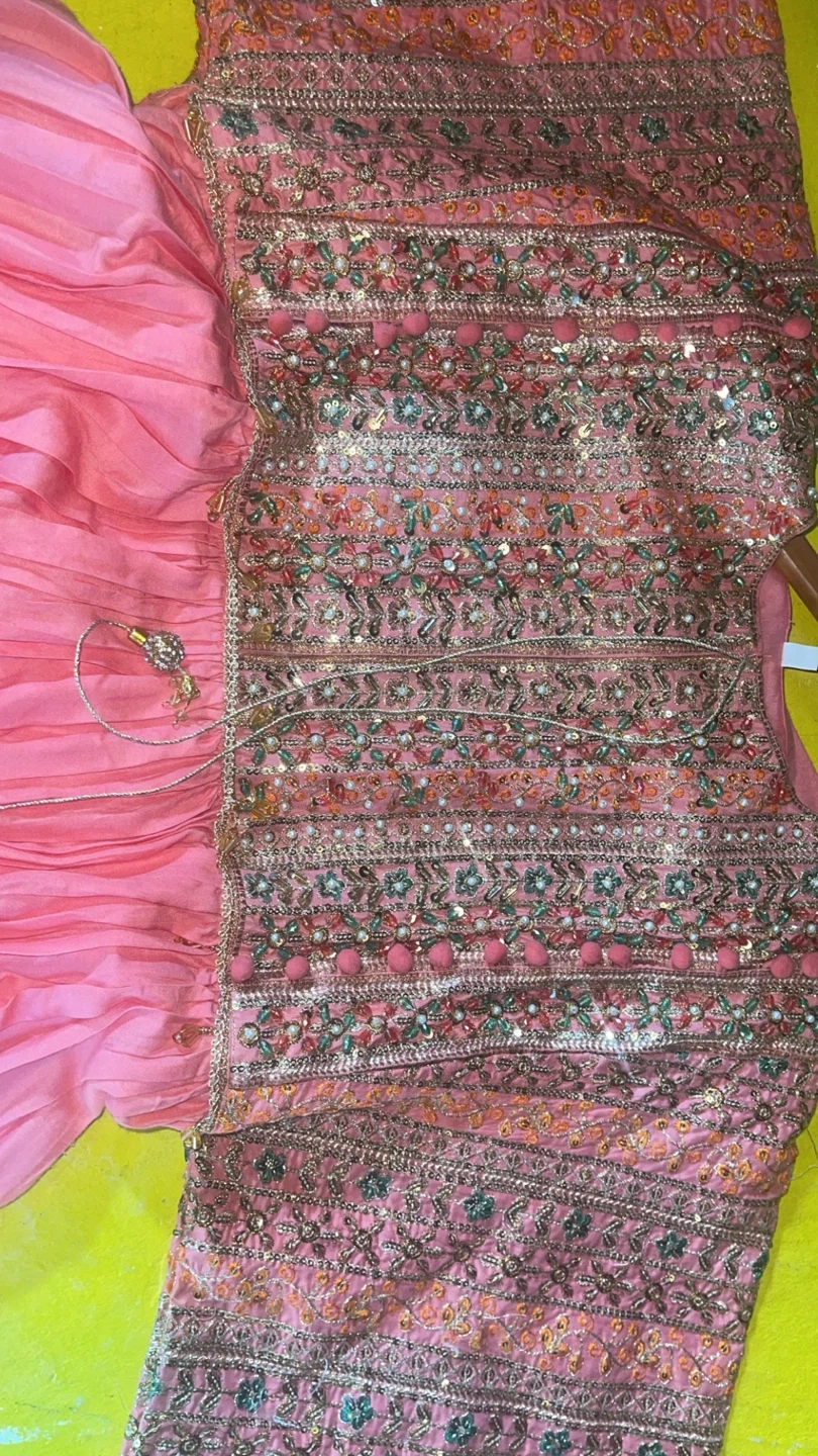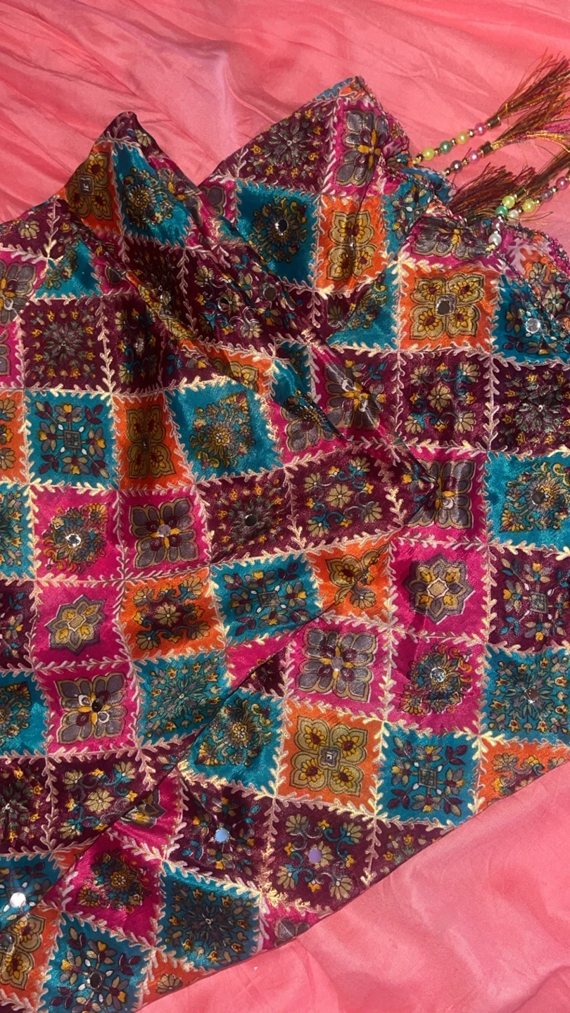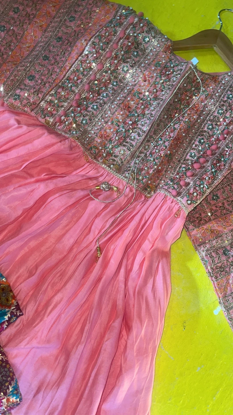 This beautiful pink kurti set features intricate embroidery and sequins on the bodice and sleeves. It's paired with a flowy pink skirt and a colourful printed dupatta with tassels. Perfect for festive occasions!