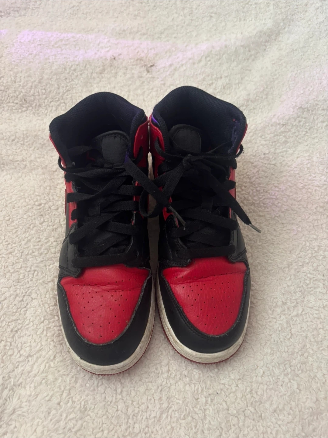 Black and red Air Jordan 1 Mid sneakers. US size 5. Leather upper with rubber sole. Also fits women size 7- 8 1/2.