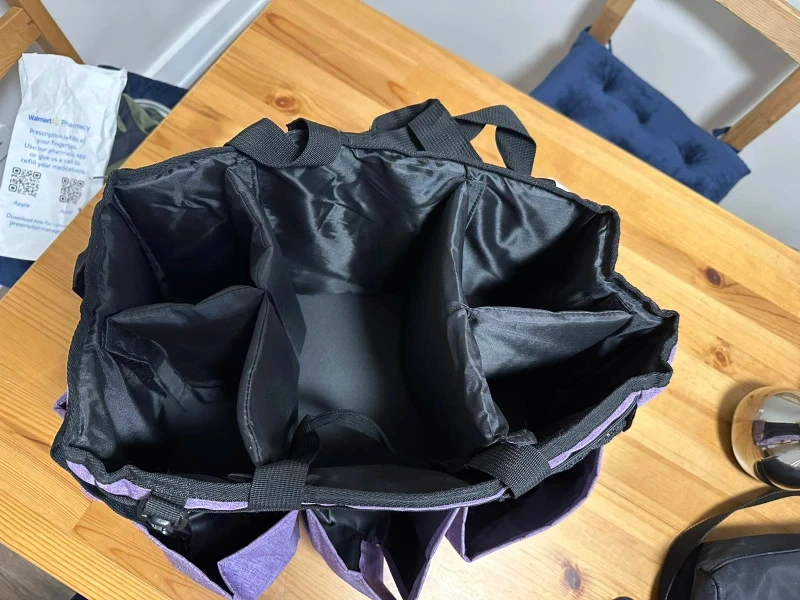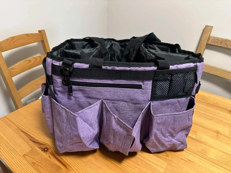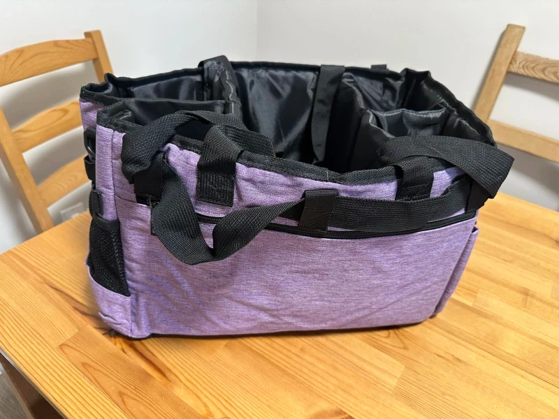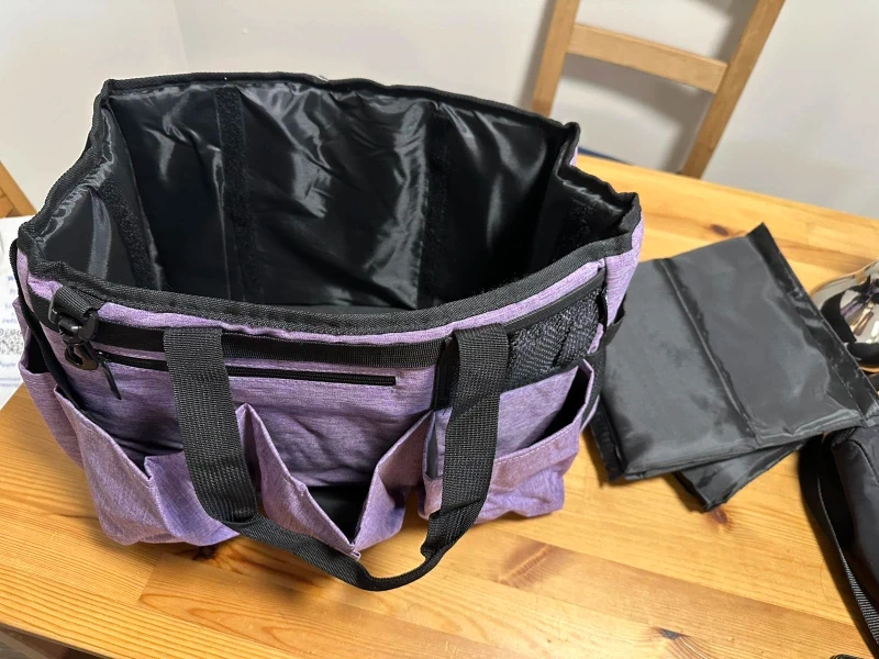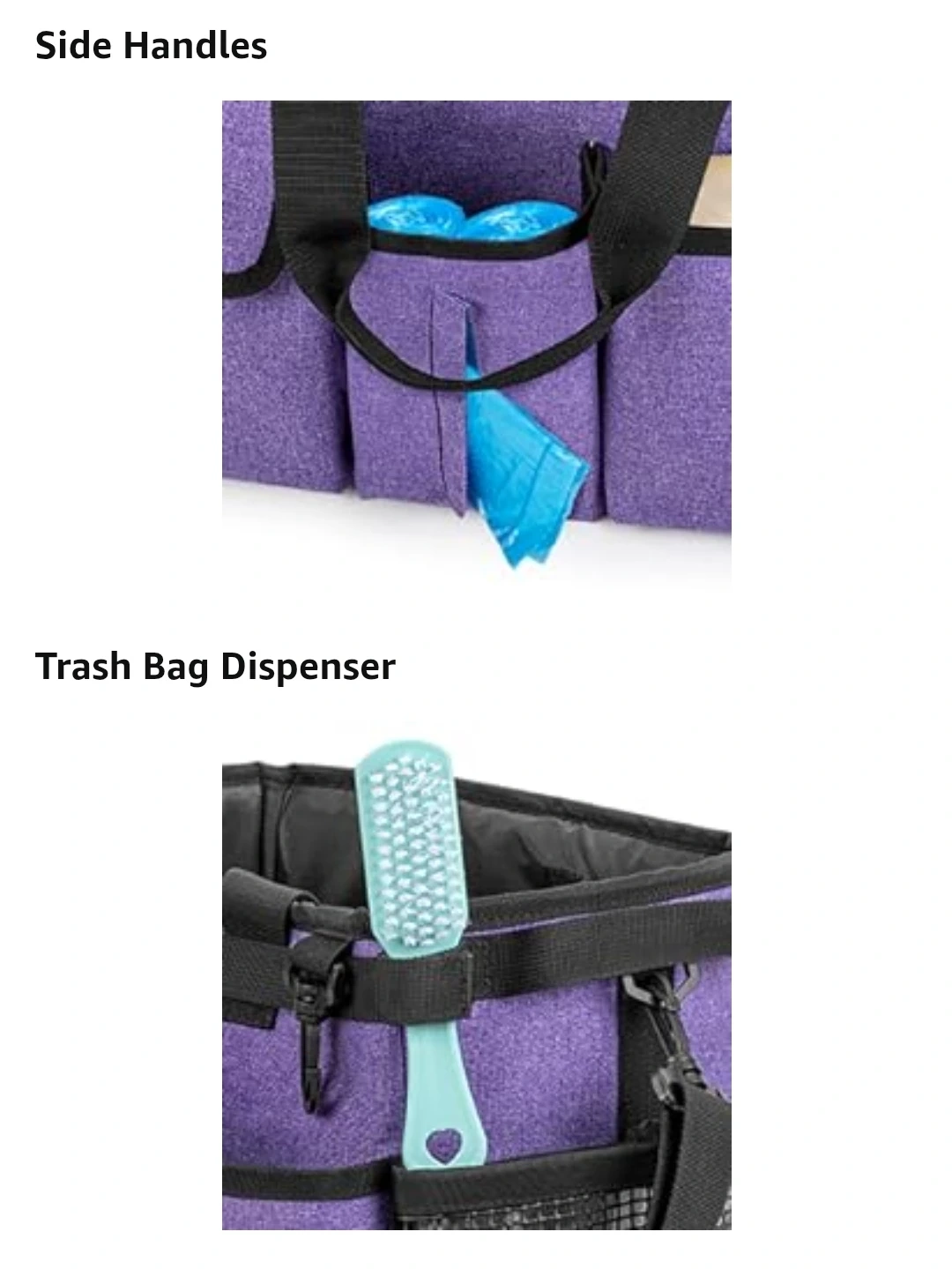 Large tote bag, multiple pockets and compartments. Features include side handles and a built-in trash bag dispenser. Durable fabric construction. Perfect for organisation.