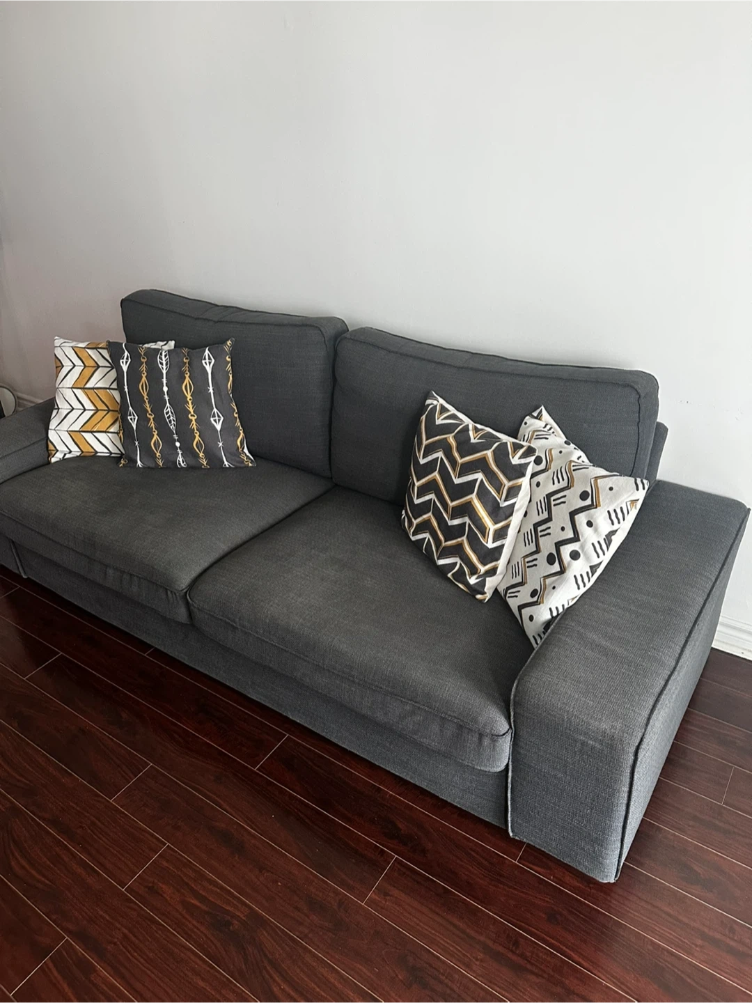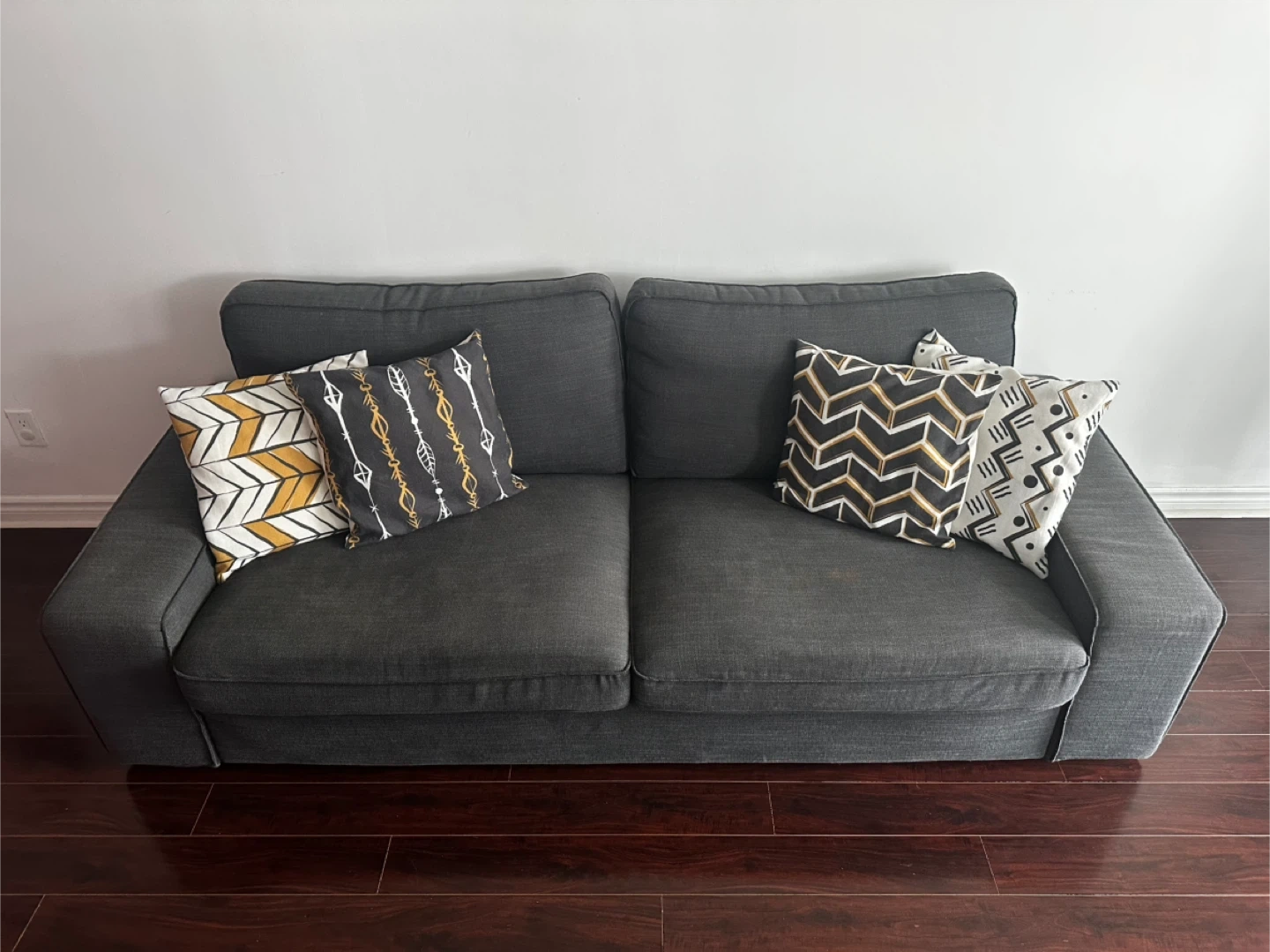 Selling a comfy IKEA Kivik 2-seat sectional sofa in grey! It's in great shape and ready for a new living room. The Kivik series is known for its deep, low seating and soft cushions, perfect for relaxing. The covers are removable and washable, making it easy to keep clean. Pillows are included with our favourite covers!