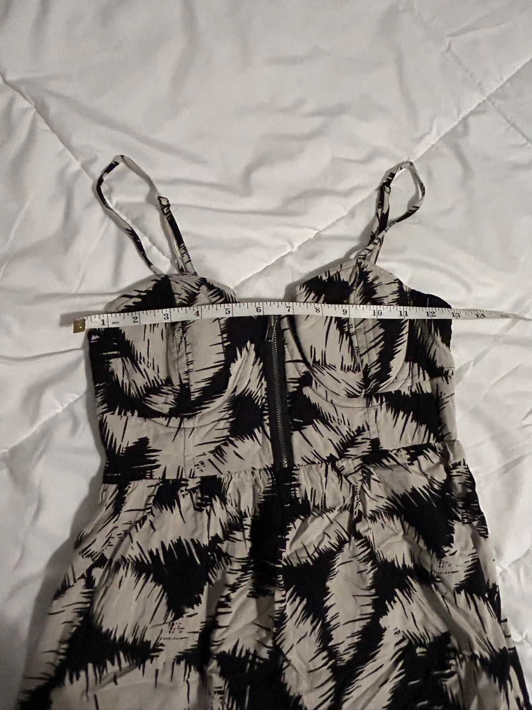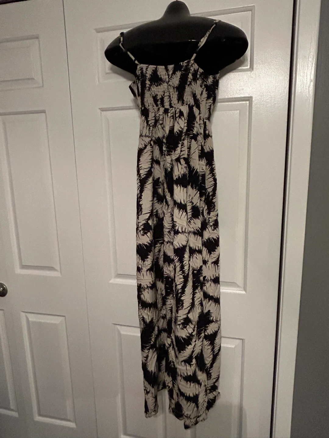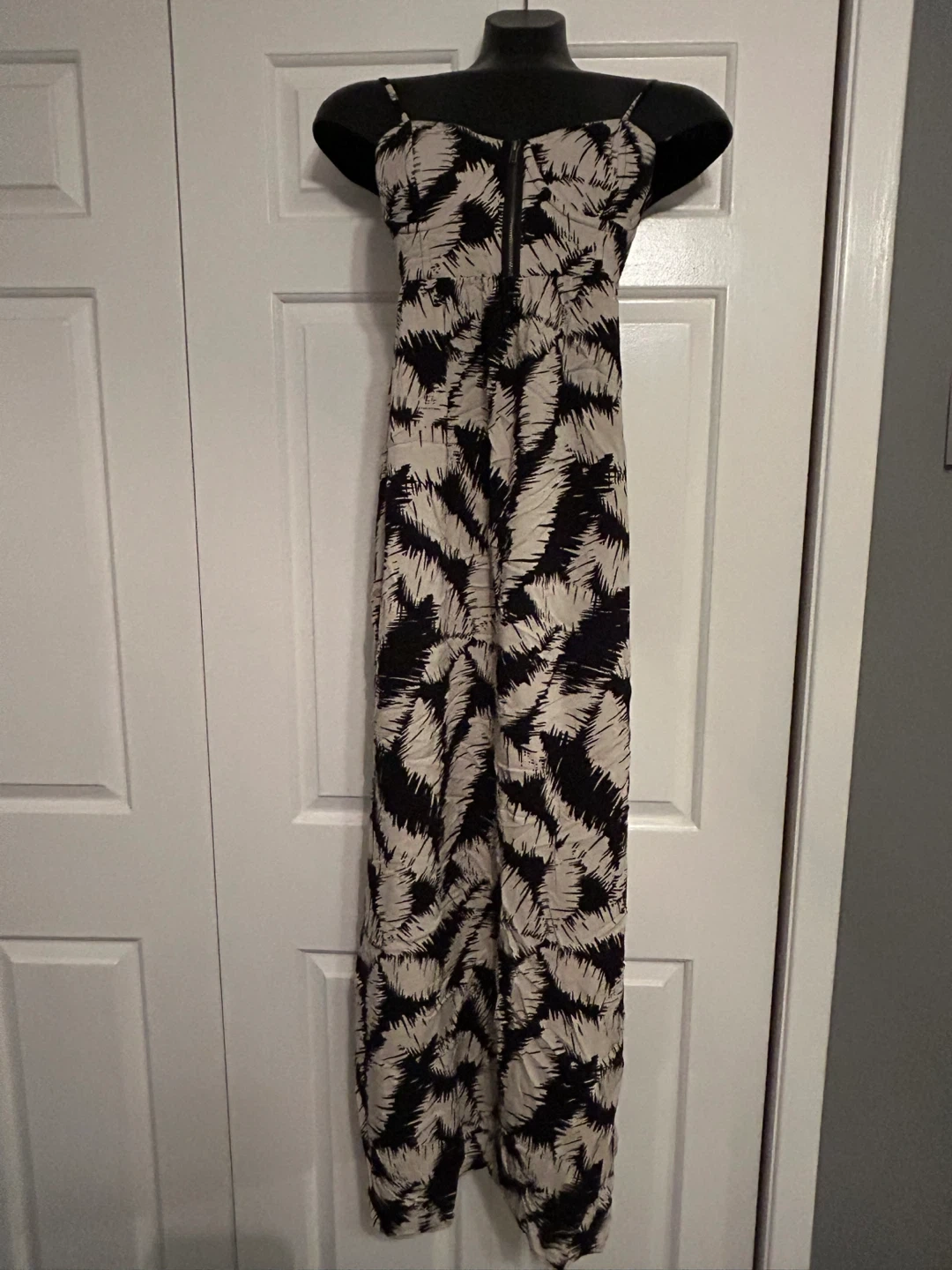 It has pockets! Maxi dress with black and cream leaf pattern. Features a flattering silhouette - corset top with front zipper, ruched elastic in back, and adjustable shoulder straps. Size XS measurements in photos.