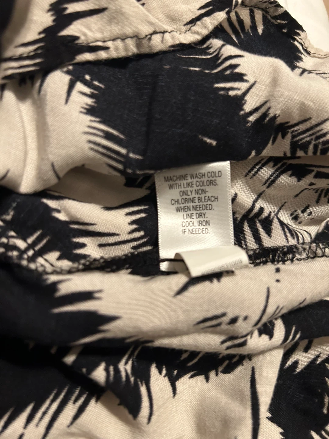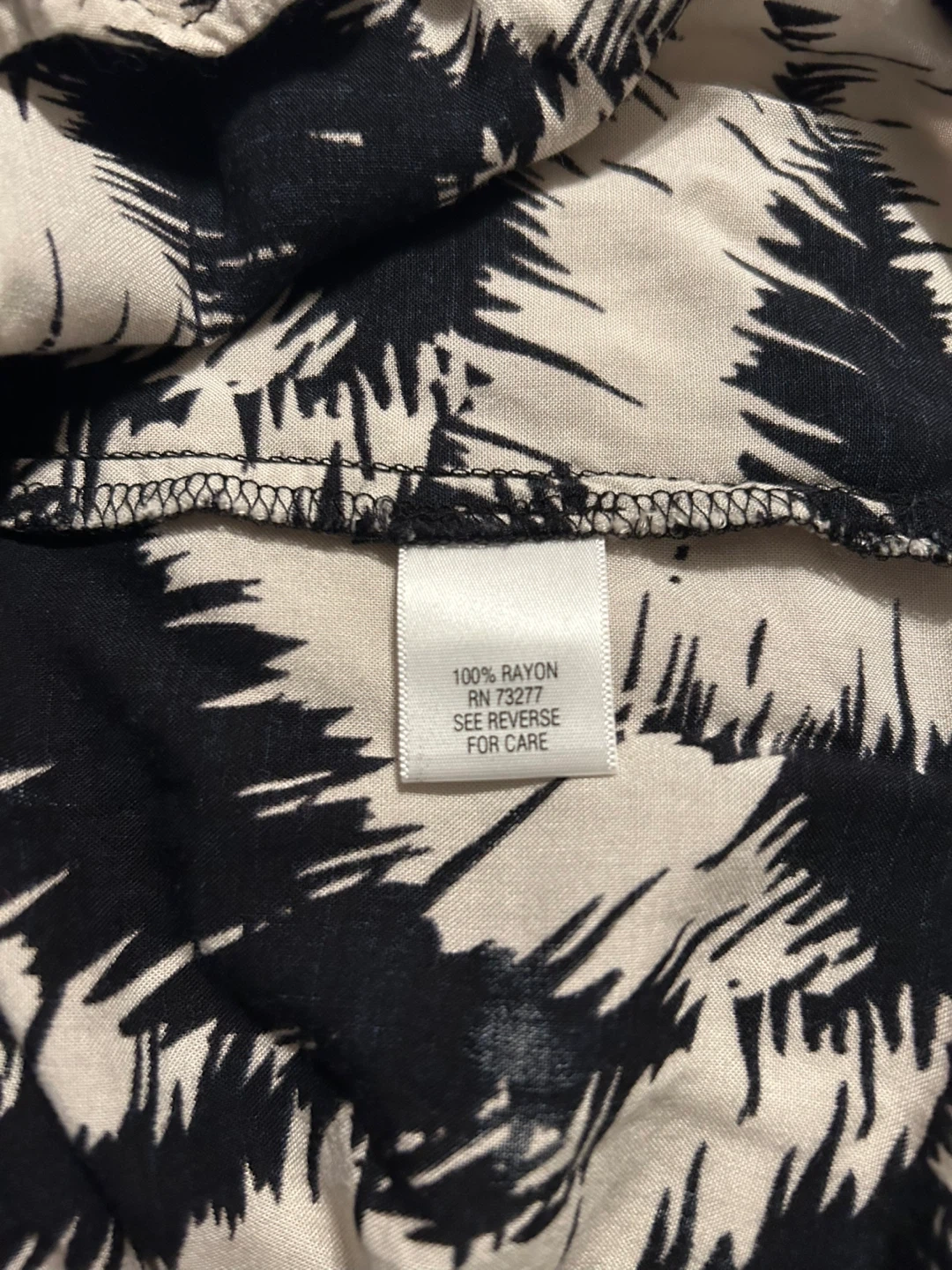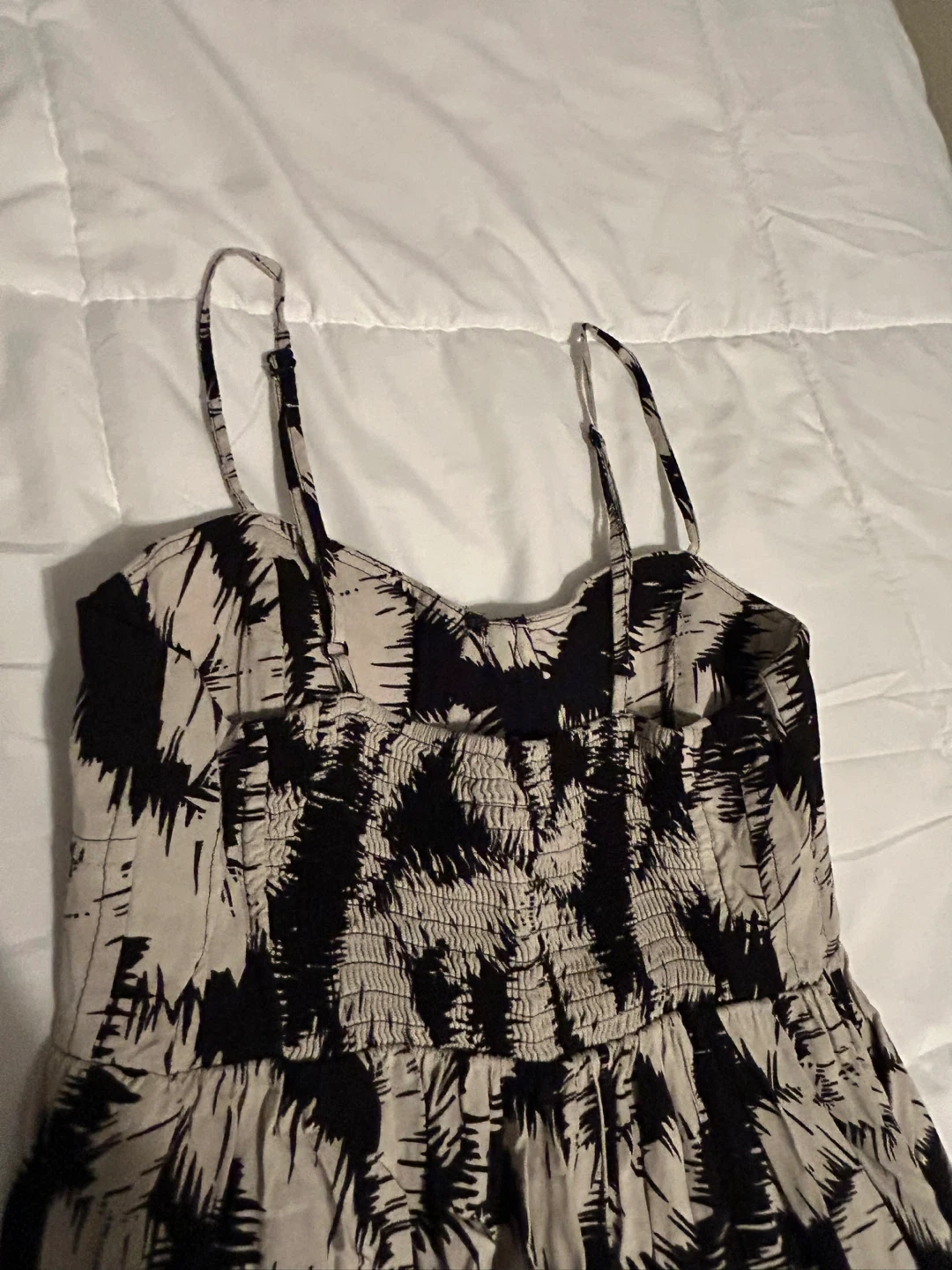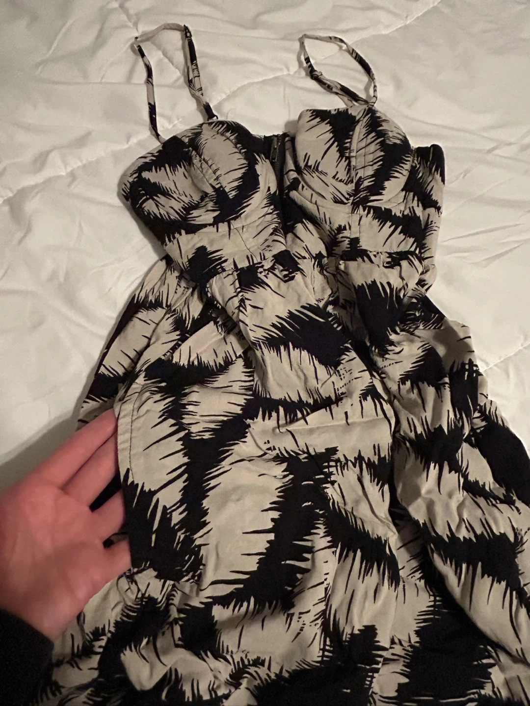 It has pockets! Maxi dress with black and cream leaf pattern. Features a flattering silhouette - corset top with front zipper, ruched elastic in back, and adjustable shoulder straps. Size XS measurements in photos.