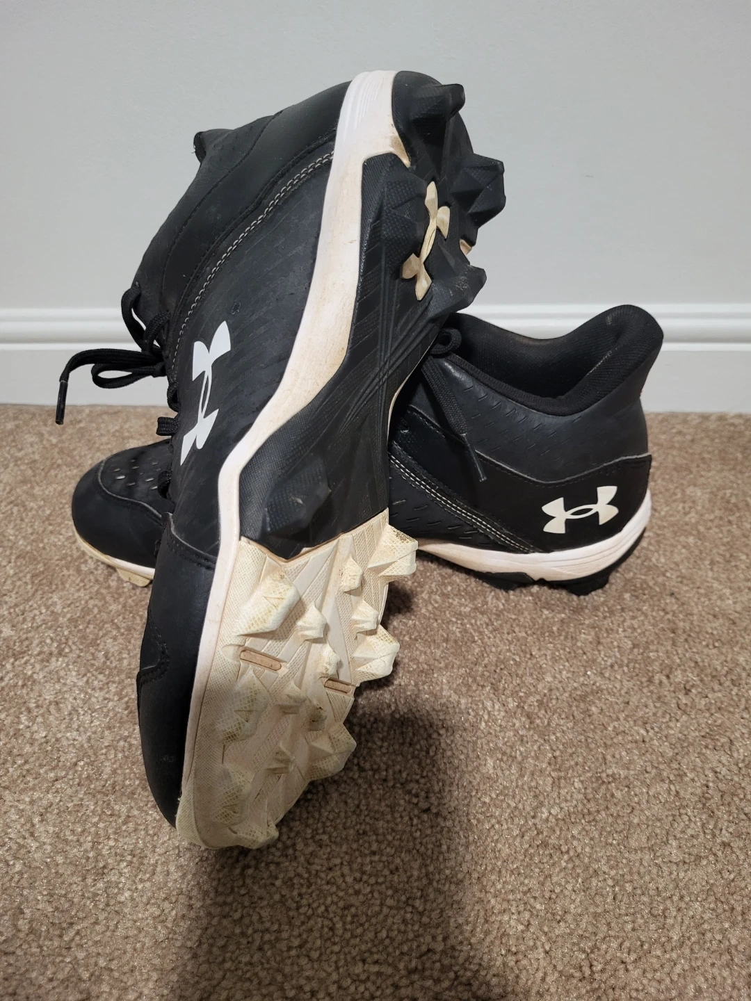 Black Under Armour baseball cleats. It's a size 9 US. These cleats are ready for the diamond!