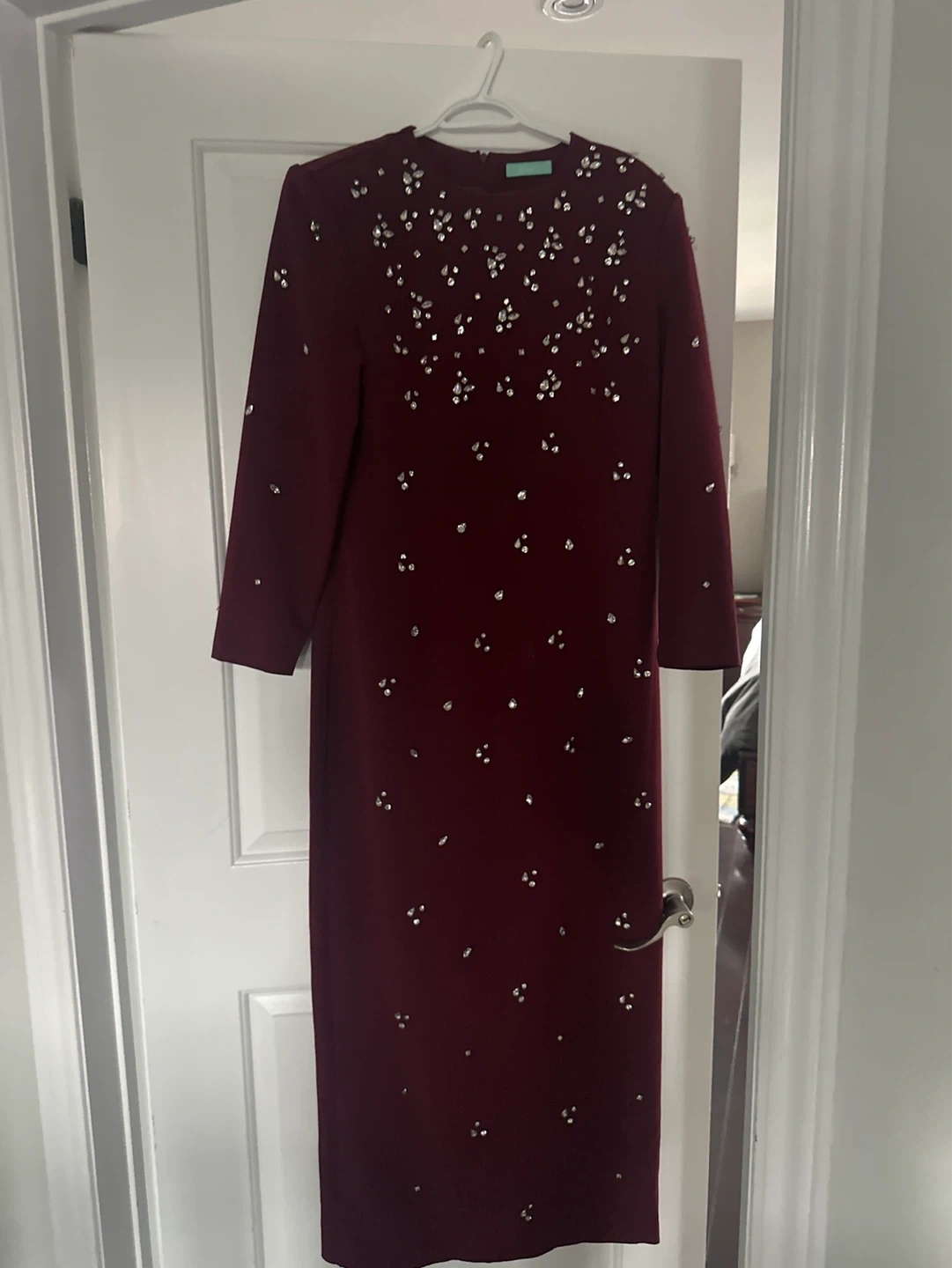 Burgundy floor length long-sleeved dress with all-over silver embellishments that’s sewn on. Crew neckline with a concealed back zipper and small slit. Size XL fits size 10-12
