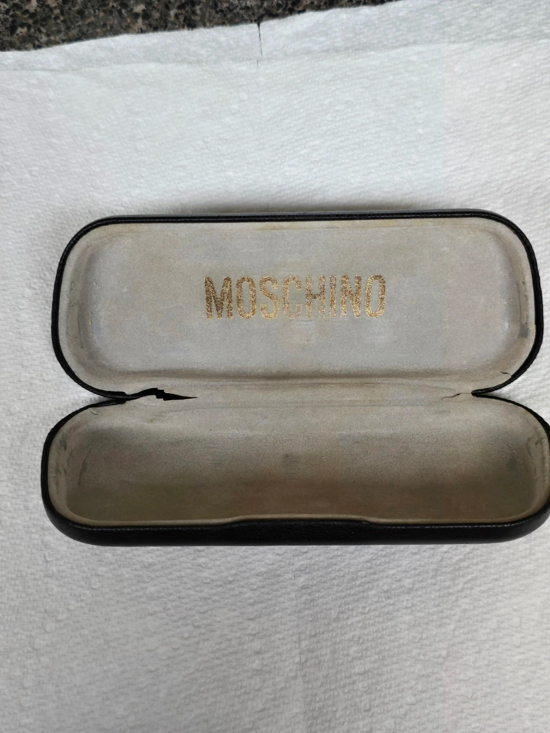 Black hard shell eyeglass case with Moschino logo inside. It's a sturdy case for protecting your glasses. This case would be useful for anyone who owns a pair of Moschino or other brand eyeglasses.