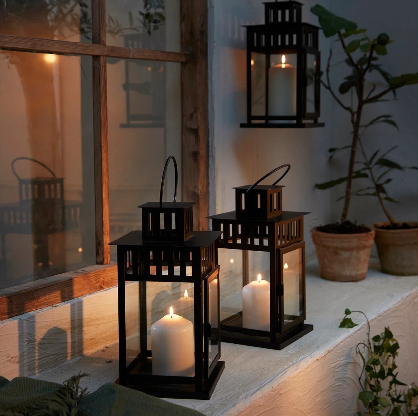 A stylish black metal lantern with glass panels. It's suitable for indoor or outdoor use. This lantern creates a lovely ambiance with a candle inside!