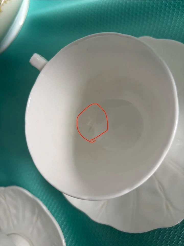 Aynsley white crocus teapot with 4 teacups and saucers. Teapot is missing its stamp and there is a hairline crack in one of the cups (circled in picture 3). Pick up in Keswick.