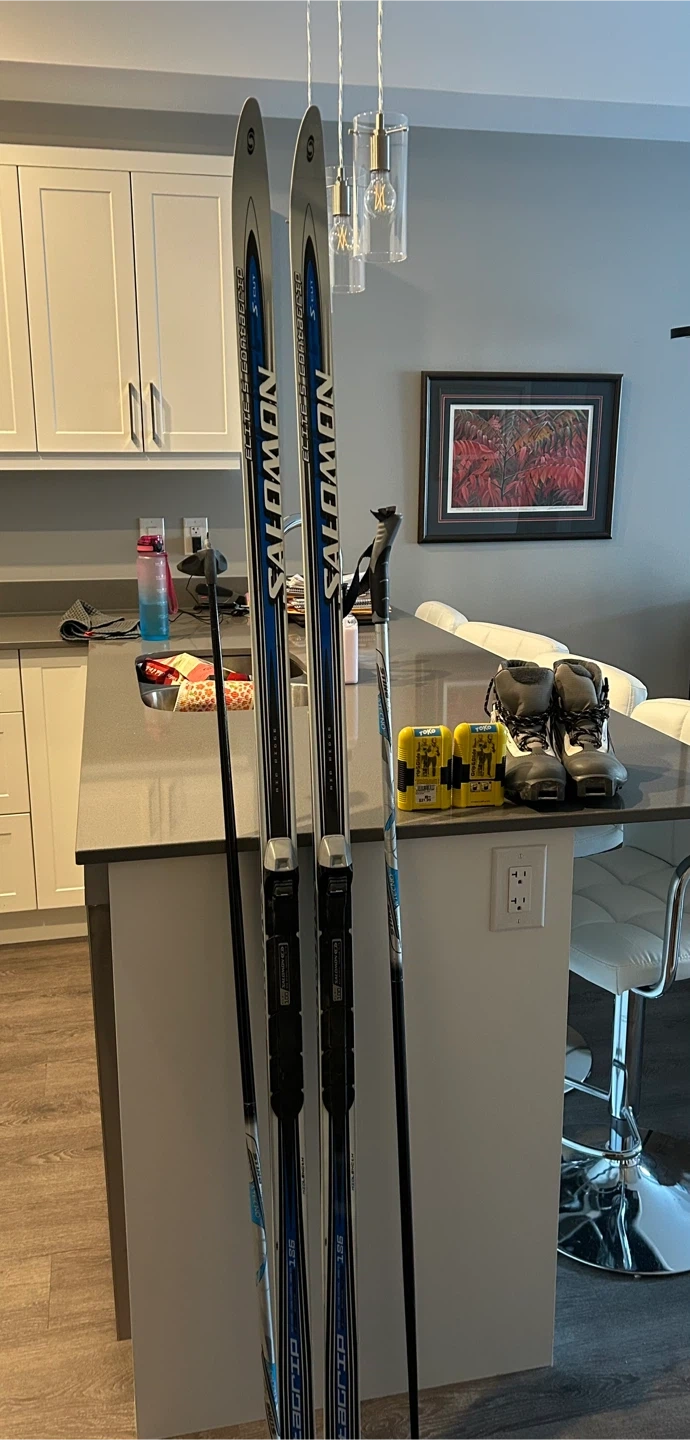 This is a set of Salomon cross-country skis, poles, and boots. The skis feature a blue and silver design. It includes two pairs of ski poles and a pair of winter boots. Great for hitting the trails this season!