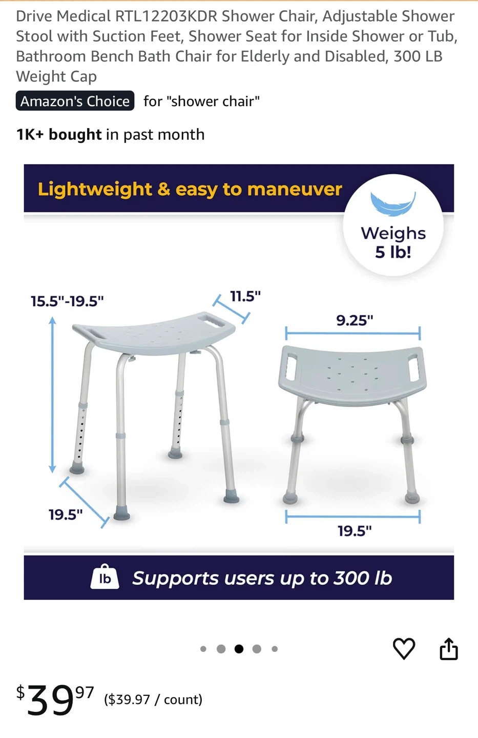 Drive Medical adjustable shower stool with suction feet. Seat height is adjustable from 15.5" to 19.5". It weighs 5 lbs and supports users up to 300 lbs. Perfect for use inside a shower or tub.