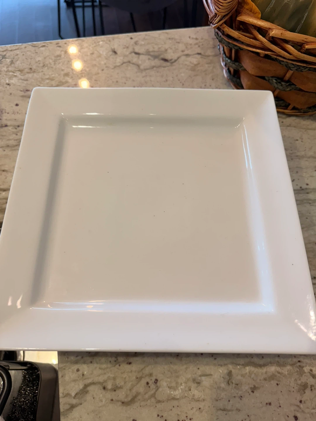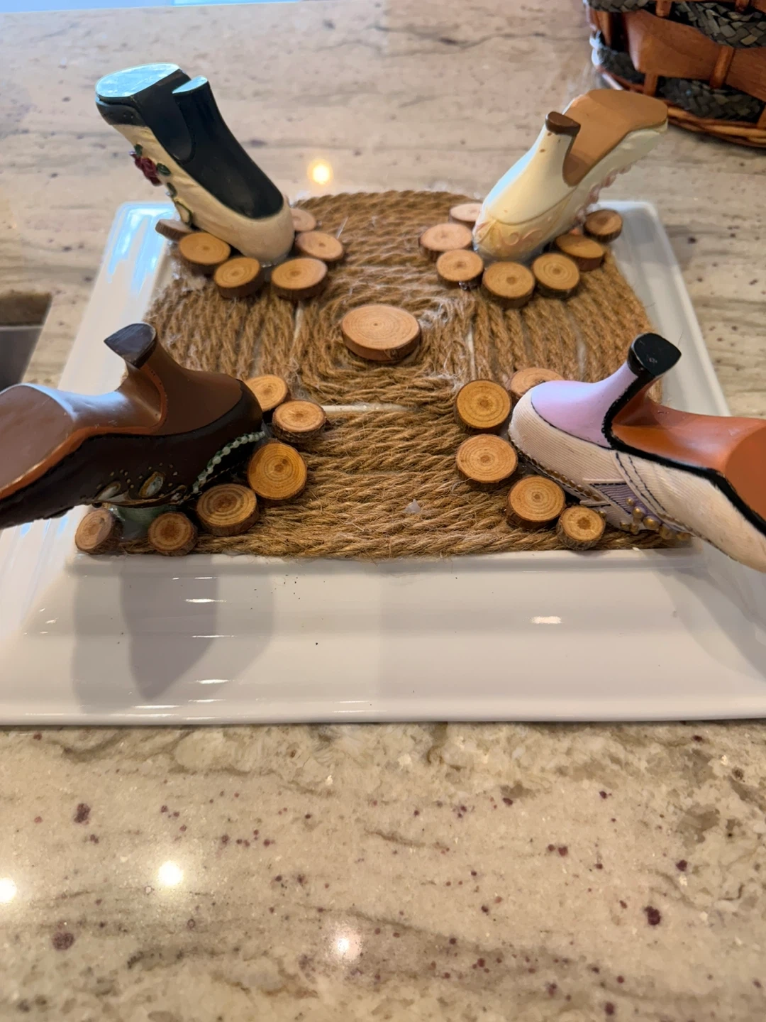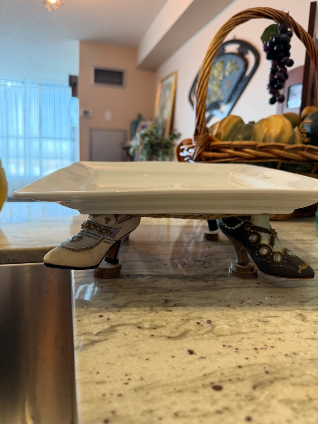 Square white serving platter with four decorative shoe-shaped legs. It's made of ceramic with a rope and wood accent design. This unique piece is perfect for displaying appetizers or desserts!
