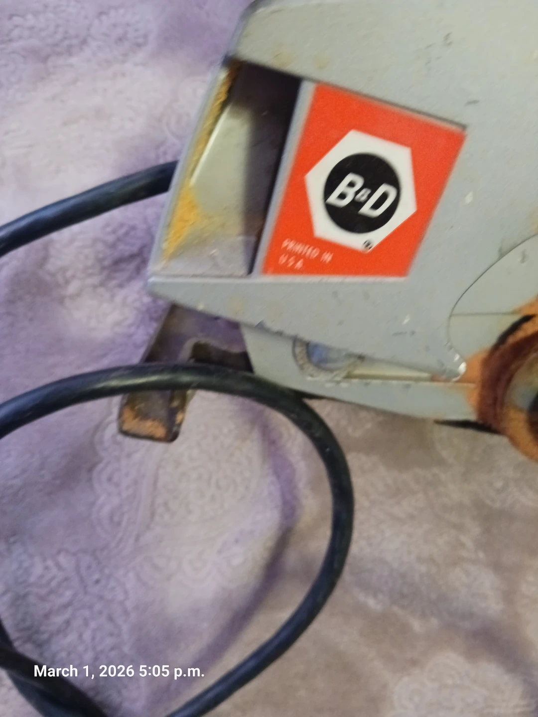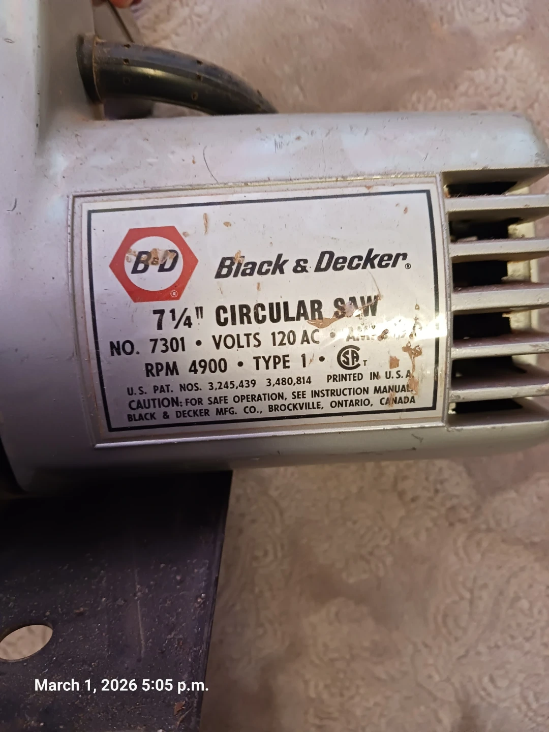 This is a Black & Decker 7 1/4" circular saw. It's a Type 1 model with a 120 AC voltage rating and 4900 RPM. Saw is made by Black & Decker Mfg. Co. in Brockville, Ontario, Canada. It's suitable for various cutting tasks.