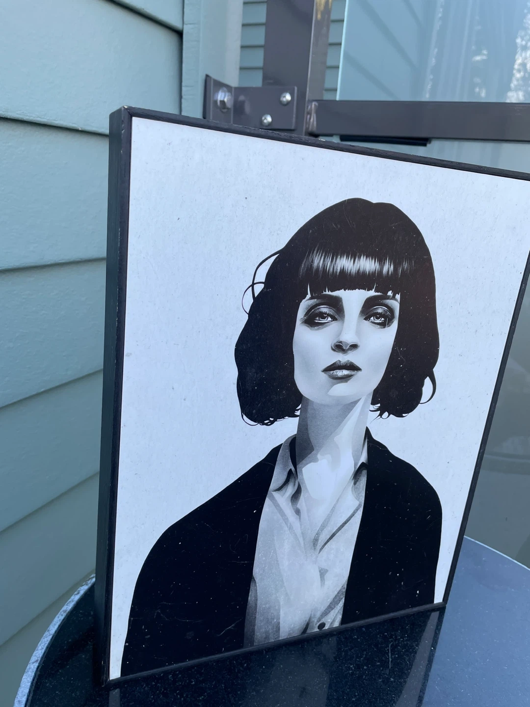 This framed art print features Mia Wallace from Pulp Fiction. It's made by Eyes on Walls and includes a black wood frame. 9.5” x 12”.