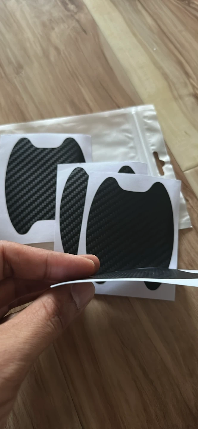 These carbon fiber style stickers protect your car's door handles from scratches. They're easy to apply with their adhesive backing. Each sticker measures approximately 8.4cm by 6.6cm. Protects your paint finish!
