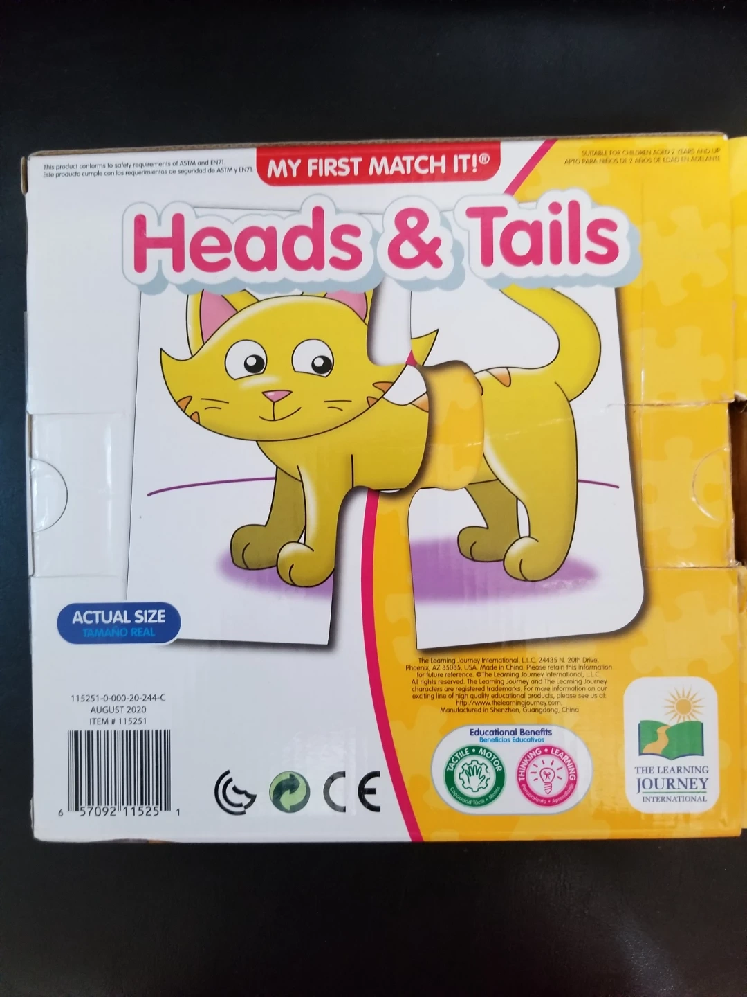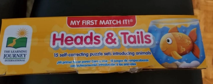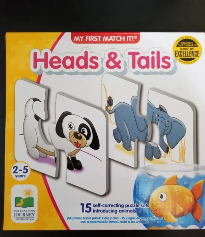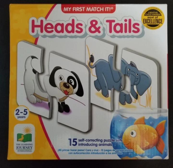 This My First Match It! Heads & Tails puzzle set introduces animals. It includes 15 self-correcting puzzle sets. Recommended for ages 2-5 years.