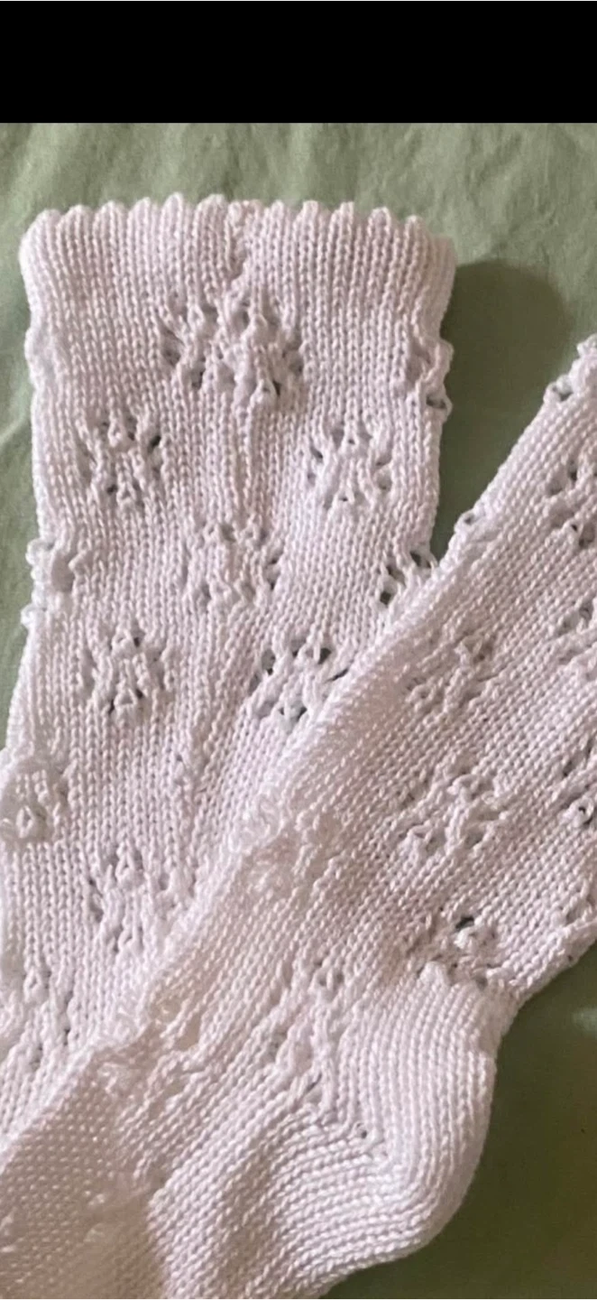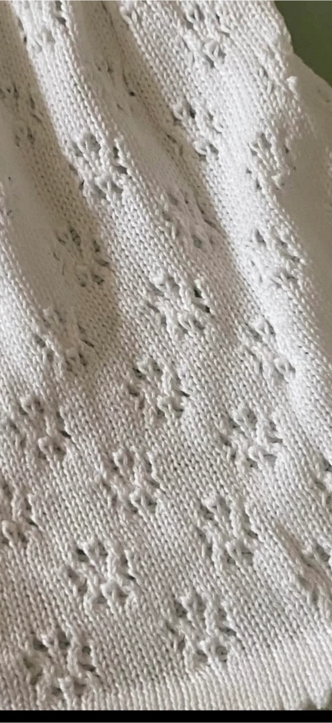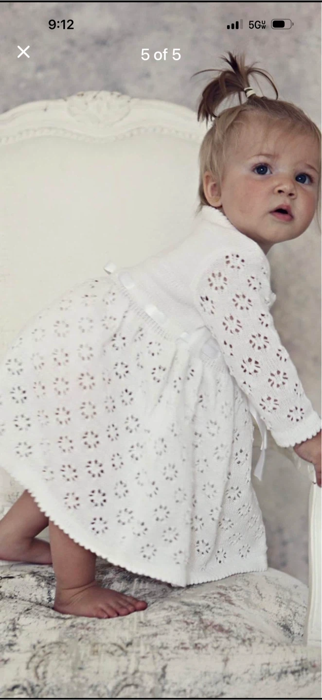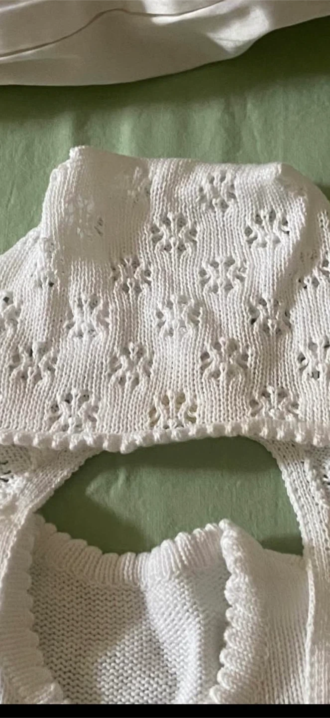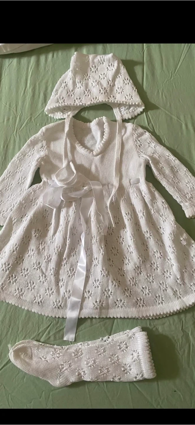 This beautiful white knit set includes a christening gown, bonnet, and socks. It features intricate floral cut-out details and delicate ribbon accents. Perfect for a special occasion! Hand made , cotton plus marine wool
