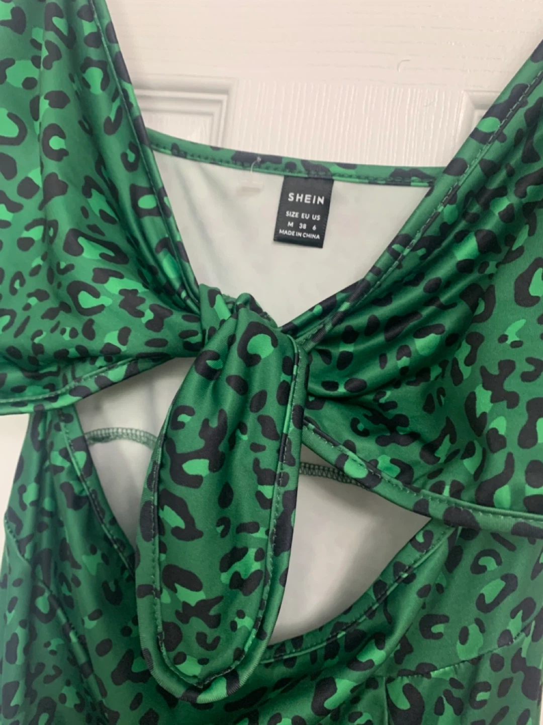 This SHEIN midi dress features a vibrant green and black leopard print with a flattering cutout design and a tie front detail. It's made of a stretchy material for comfort. The spaghetti straps make it a great option for warmer weather!