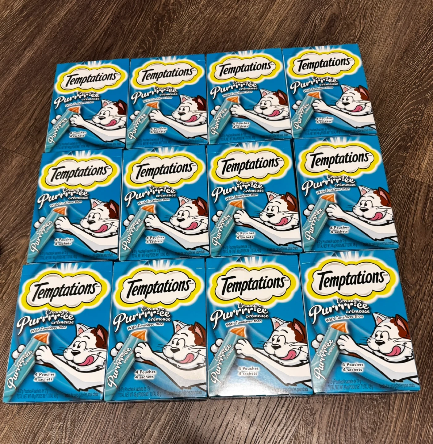 These Temptations cat treats come in 12 boxes. Each box contains 4 pouches of creamy treats with tuna flavour. It's a delicious snack for your feline friend!