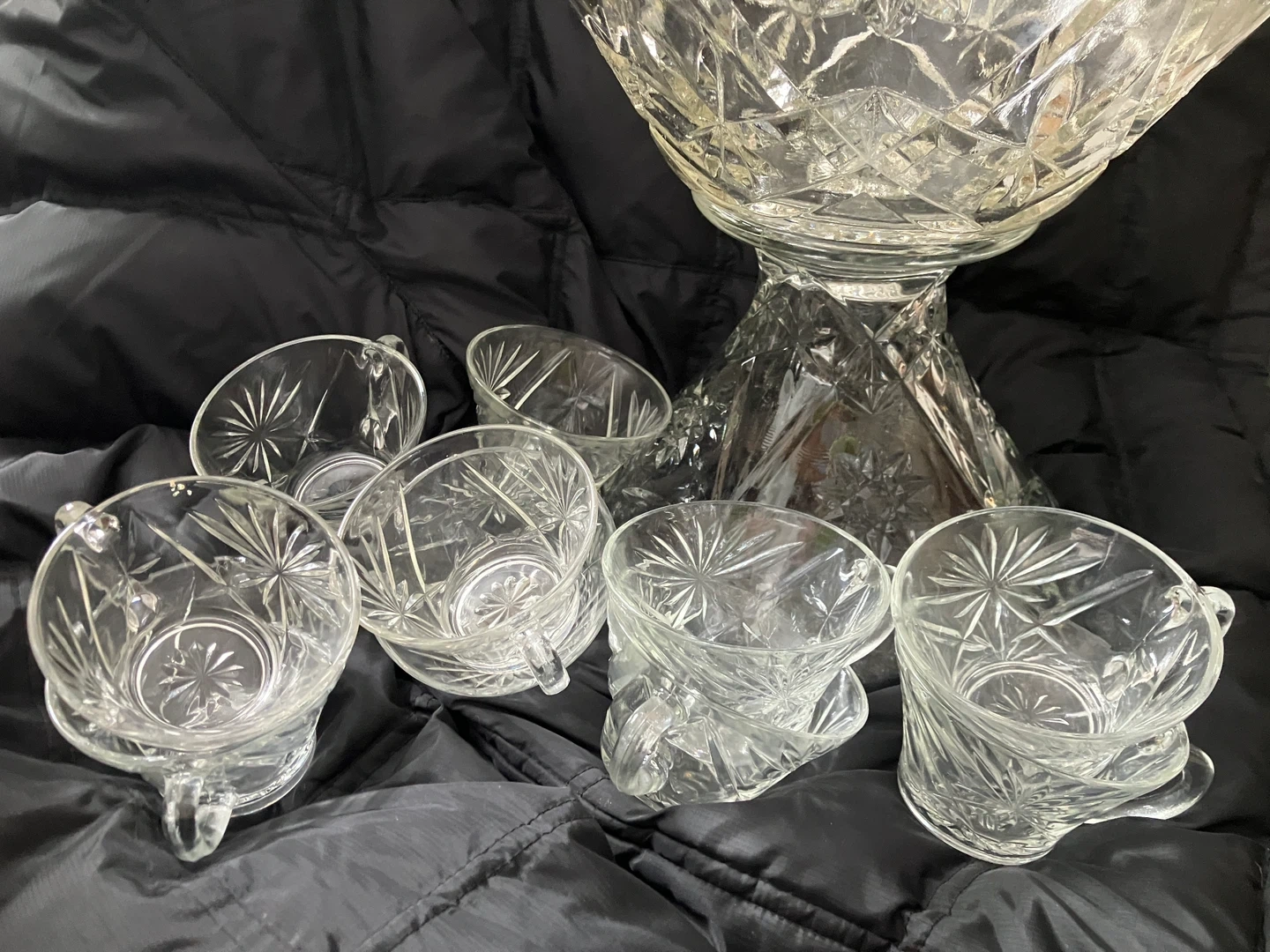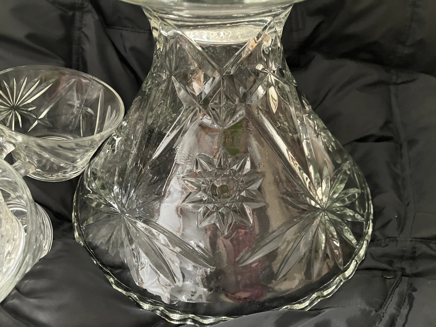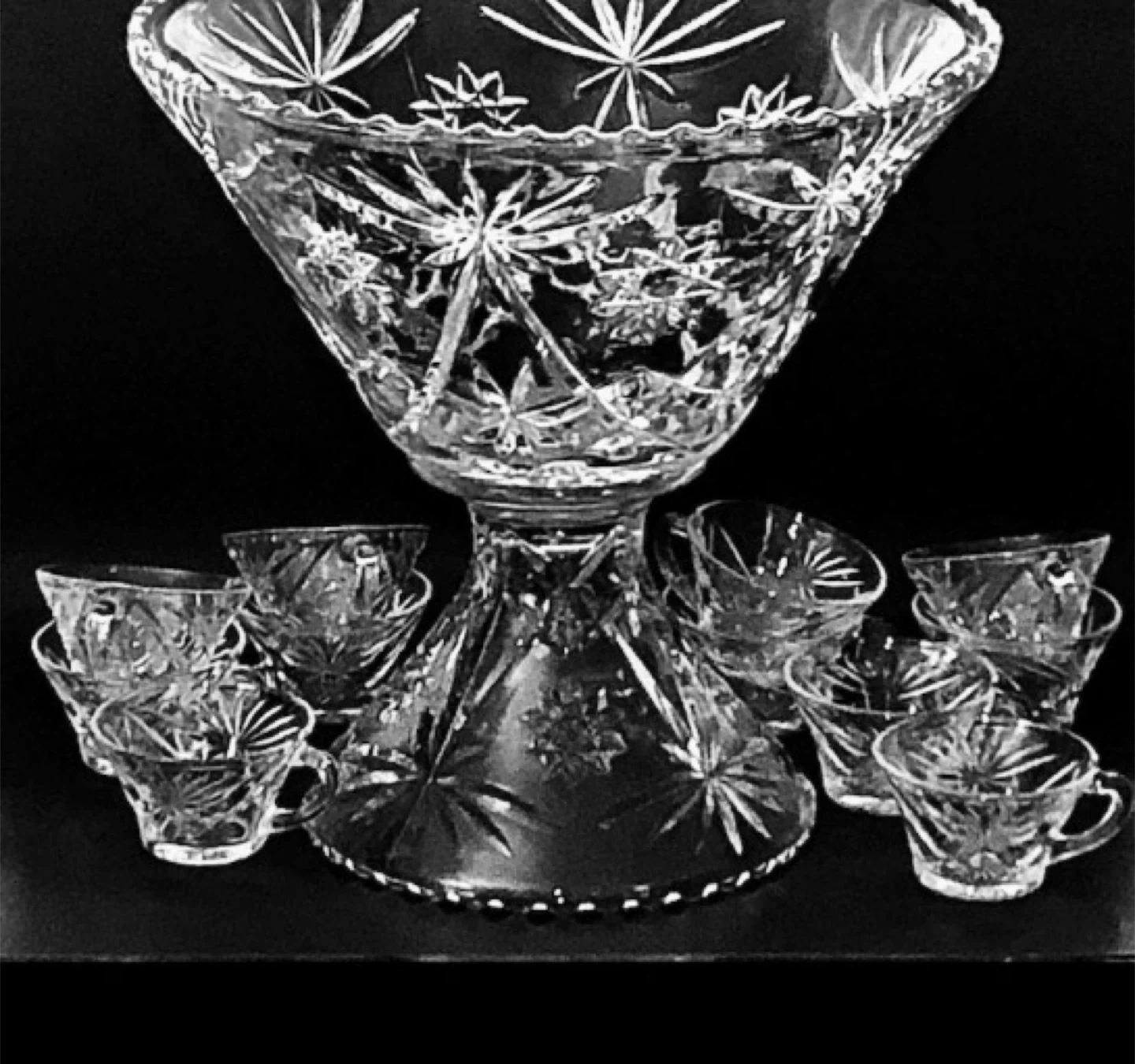 beautiful Early American Prescut Crystal punch set! punch bowl with base and matching cups. set is in great condition and comes with the original box.