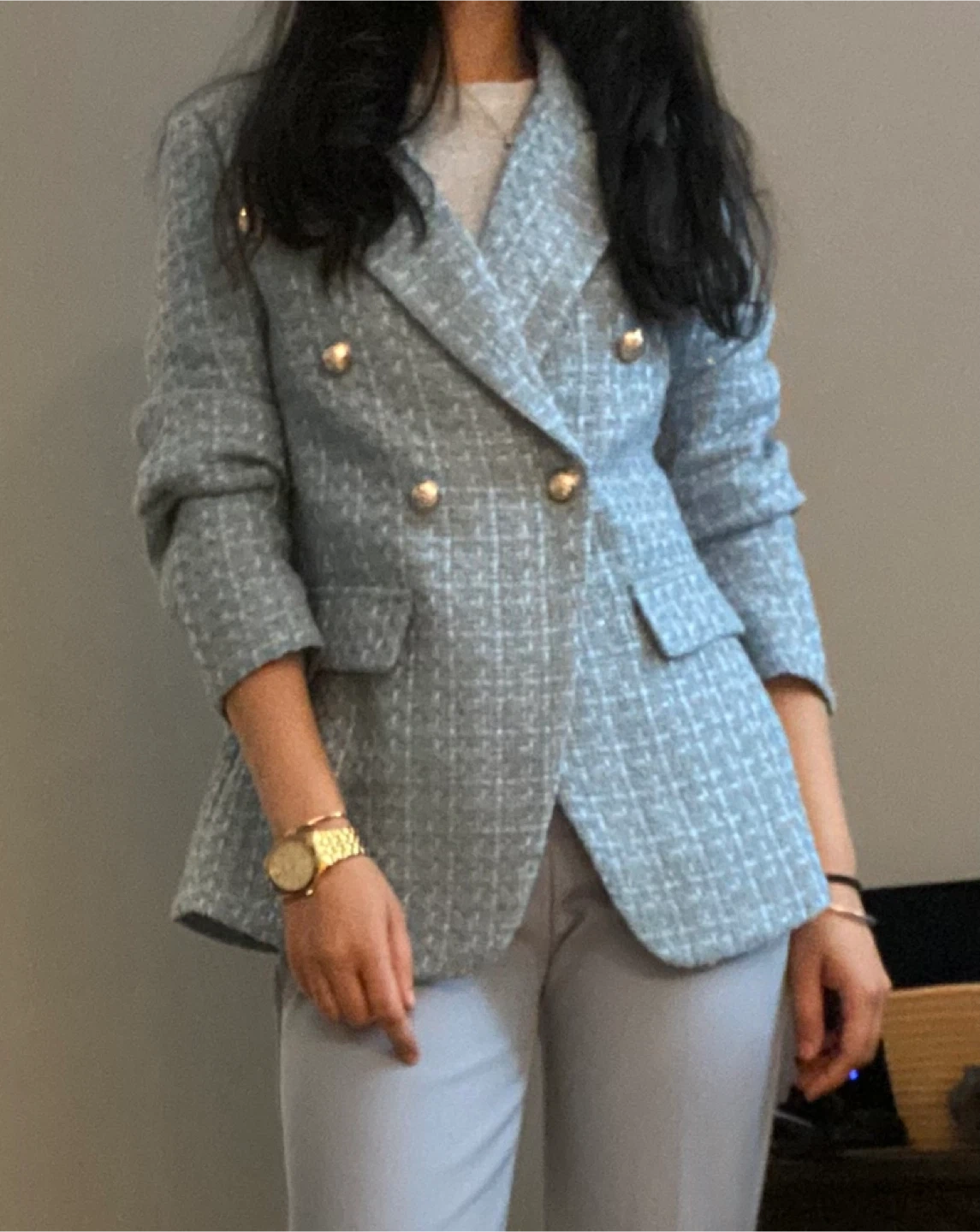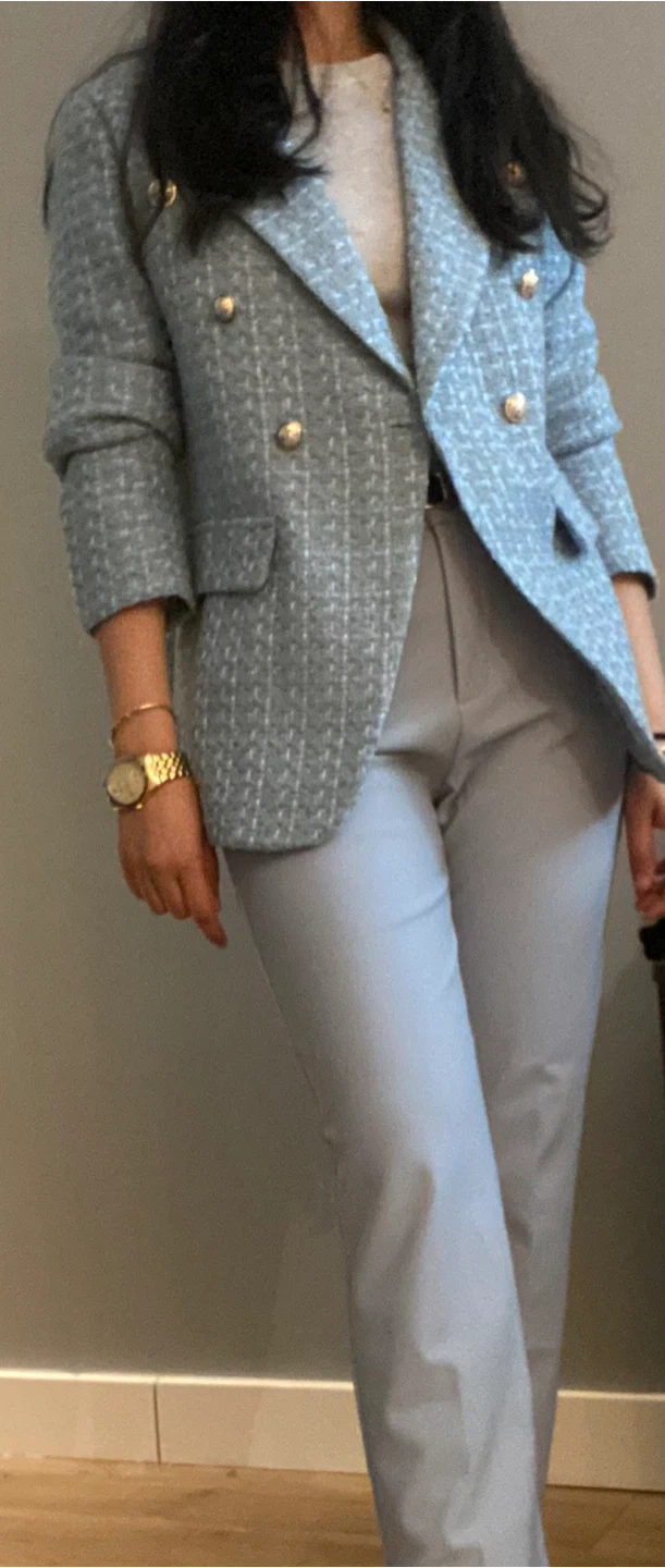 Beautiful ice blue blazer with gold metallic buttons
