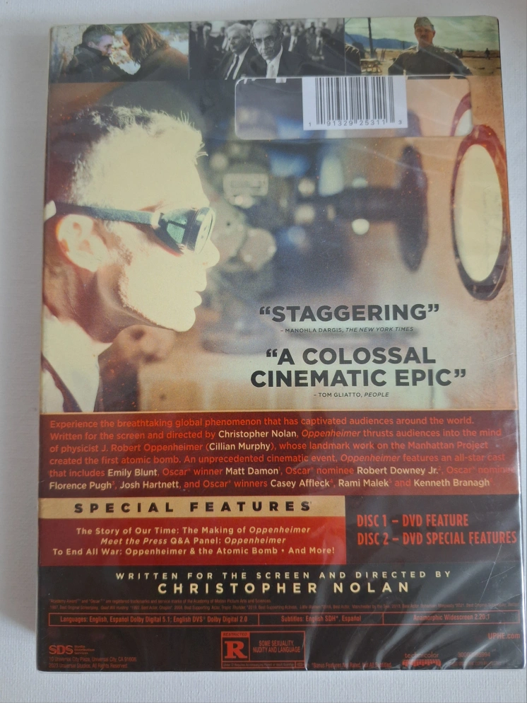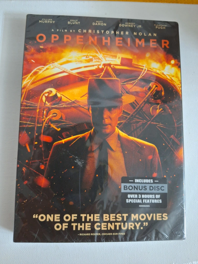 This DVD features the film Oppenheimer starring Cillian Murphy, Emily Blunt, Matt Damon, Robert Downey Jr. and Florence Pugh.