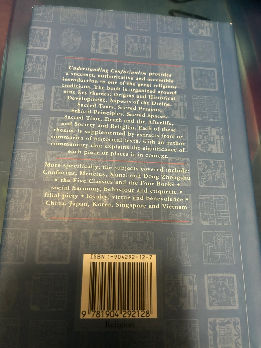 I'm selling a book titled 'Understanding Confucianism' by Jennifer Oldstone-Moore. It explores the origins, beliefs, and practices of Confucianism, including holy texts and sacred places. It provides a succinct, authoritative, and accessible introduction to one of the great religious traditions. The book is organized around nine key themes: Origins and Historical Development, Aspects of the Divine, Sacred Texts, Sacred Persons, Ethical Principles, Sacred Spaces, Sacred Time, Death and the Afterlife, and Society and Religion.