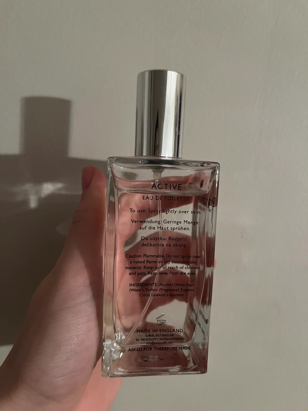 Pecksniff's Active Eau de Toilette for men. This fragrance comes in a 100 ml bottle. It's made in England. Keep away from eyes.
