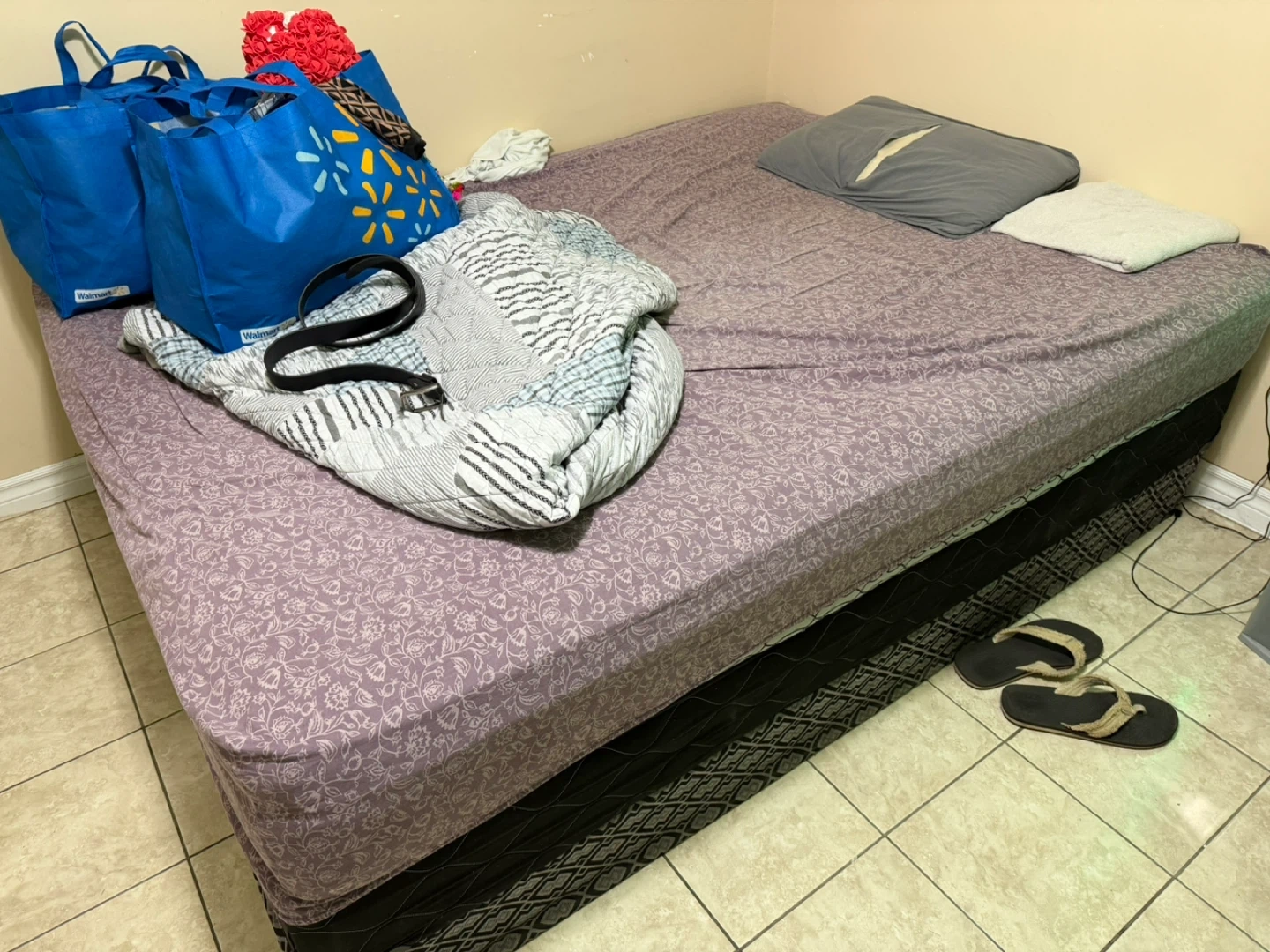 Queen size mattress with a purple floral patterned cover. It's a two-piece box spring and mattress set. Includes two pillows and a folded duvet.