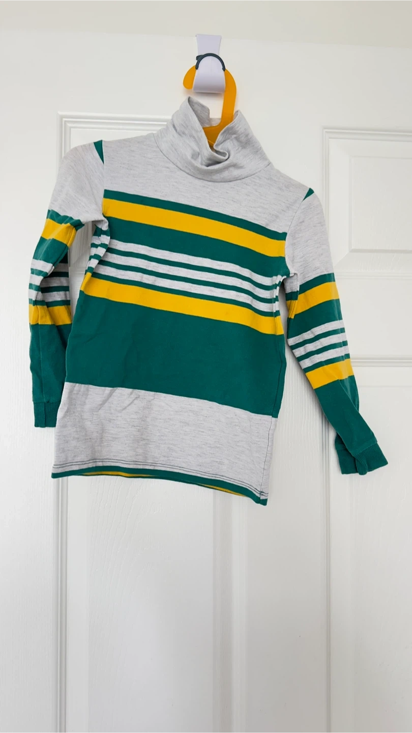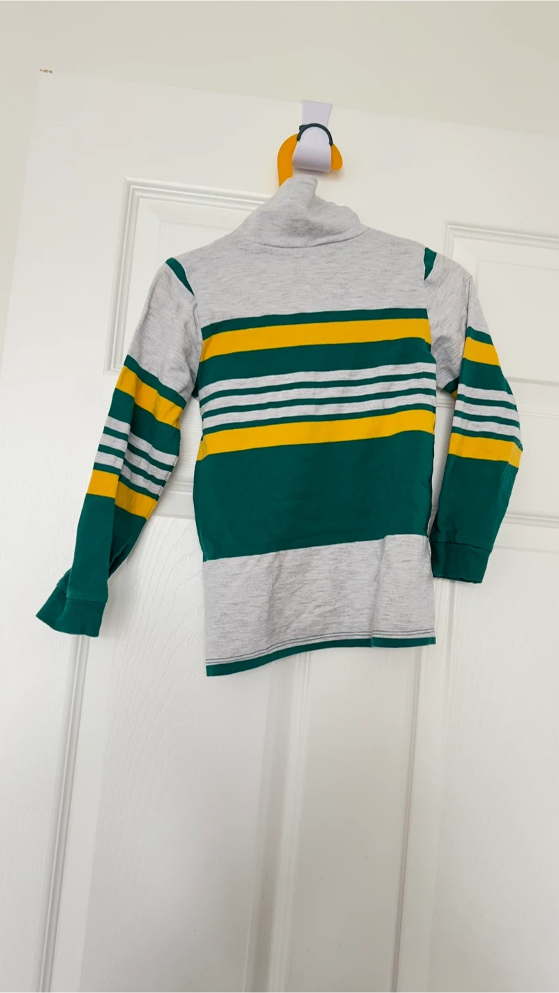 This Babyhug turtleneck shirt is designed for kids aged 5-6 years, fits better for 4.5-5.5yrs.It's made from a cotton blend for comfort. Features colourful stripes in green, yellow, and white.