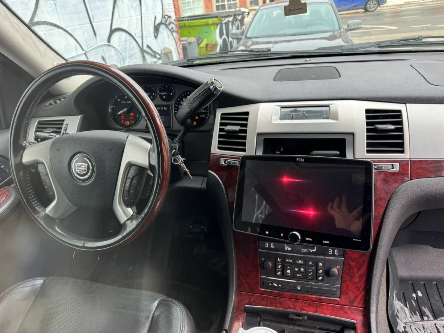 This Cadillac Escalade has 194,710 km on the odometer. It's a black SUV with a leather interior and a touchscreen infotainment system. The vehicle has a wood trim dashboard. It's a spacious SUV.