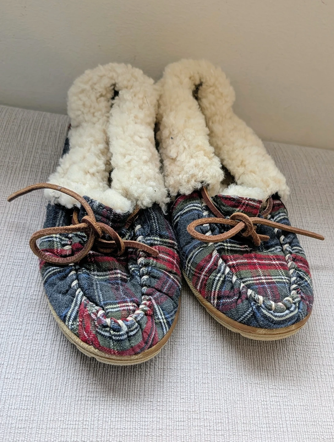 Cozy L.L.Bean moccasin slippers in women's size 9 Medium. They feature a warm fleece lining and a plaid textile upper with a leather tie detail. The rubber sole offers good traction.