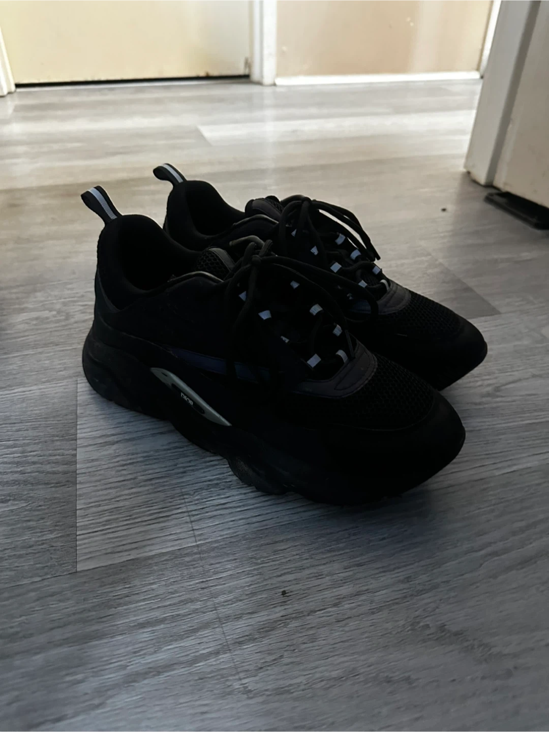 These Dior B23 sneakers are black. They're made with mesh and leather accents. These kicks are great for everyday wear!
