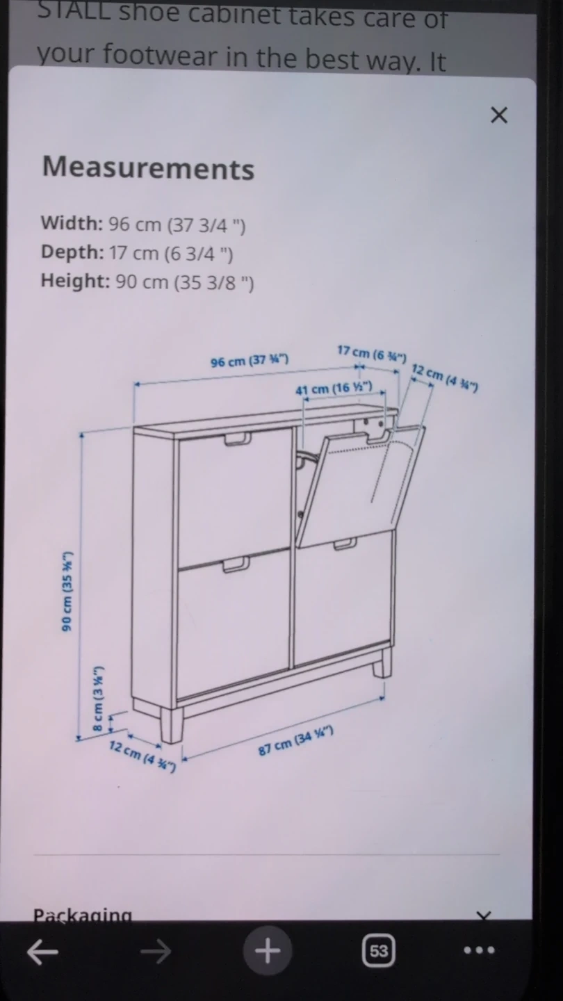 White shoe cabinet with four flip-out drawers. Fits nicely into hallways or entryways. Width is 96 cm, depth 17 cm, and height 90 cm. Keeps footwear tidy!