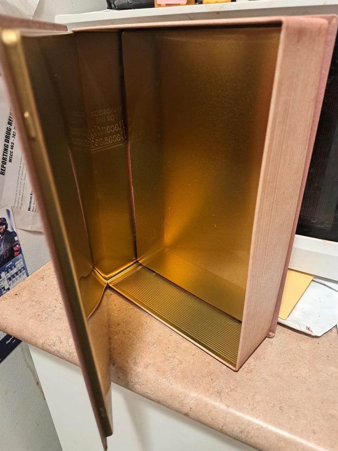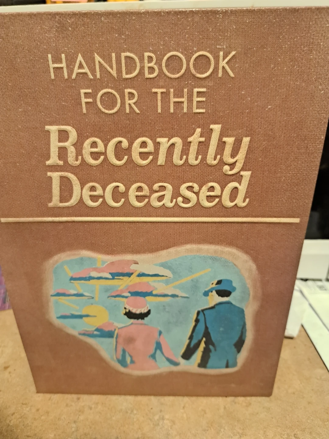 This popcorn bucket is designed to look like a book with the title "Handbook for the Recently Deceased". It has a metallic gold interior and a textured exterior. From the movie Beetlejuice Beetlejuice