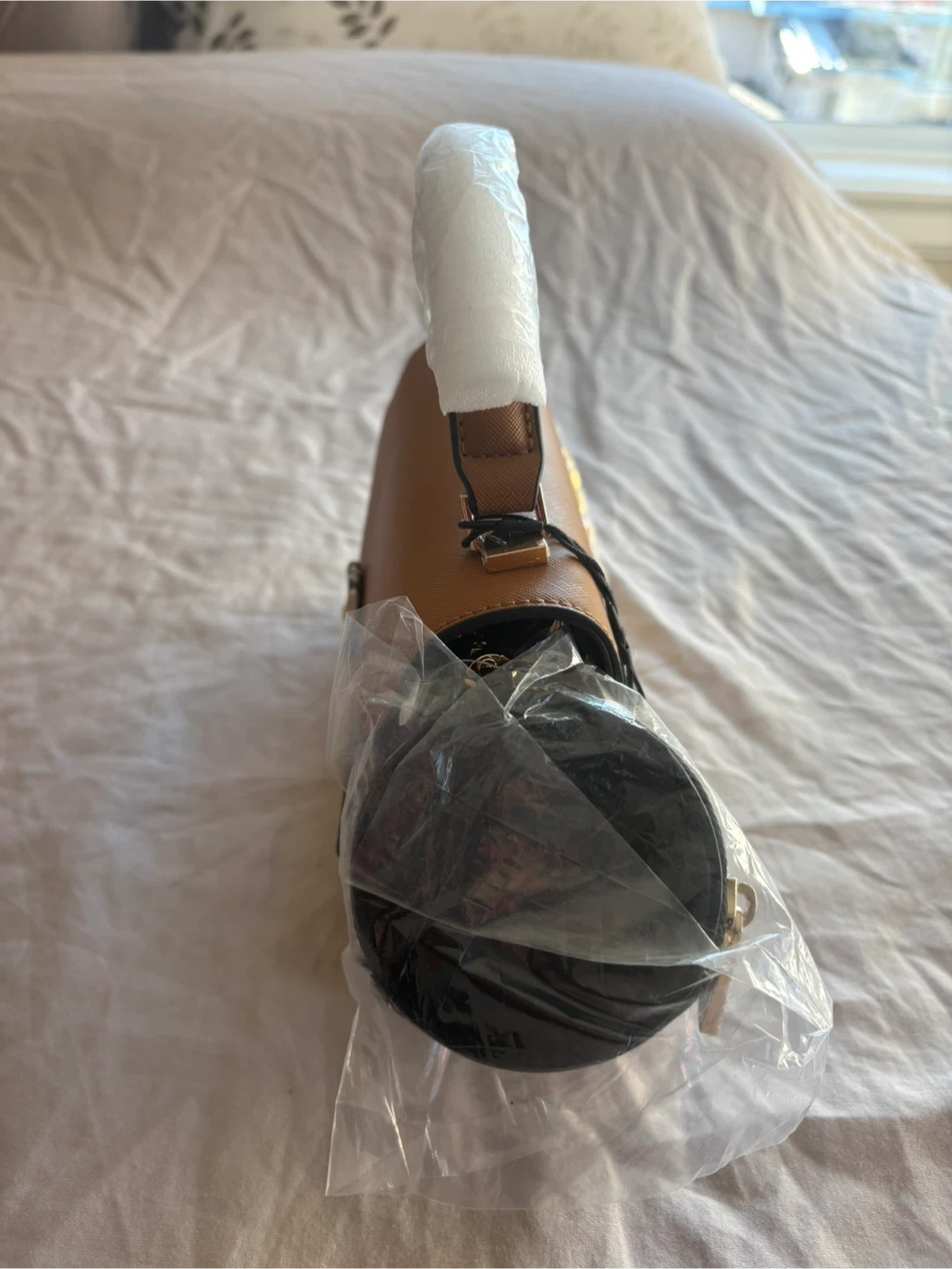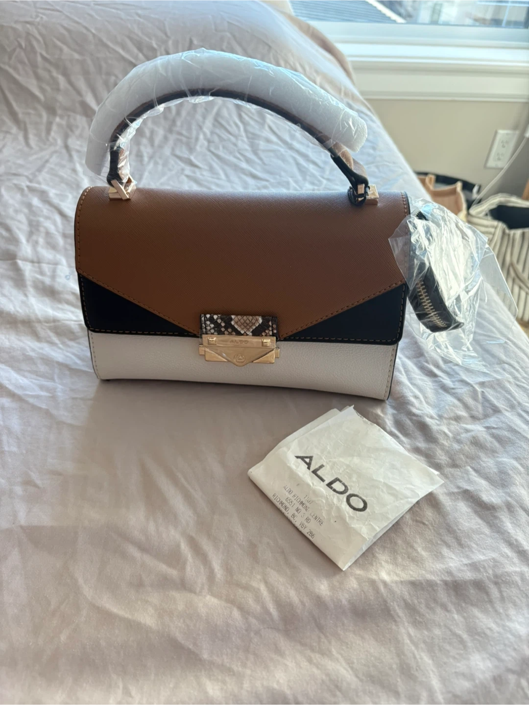 This ALDO satchel handbag features a tri-colour design with brown, white, and black panels. It has a gold-tone chain strap and a top handle. The interior includes a smaller zip pouch. It's brand new with tags still attached!