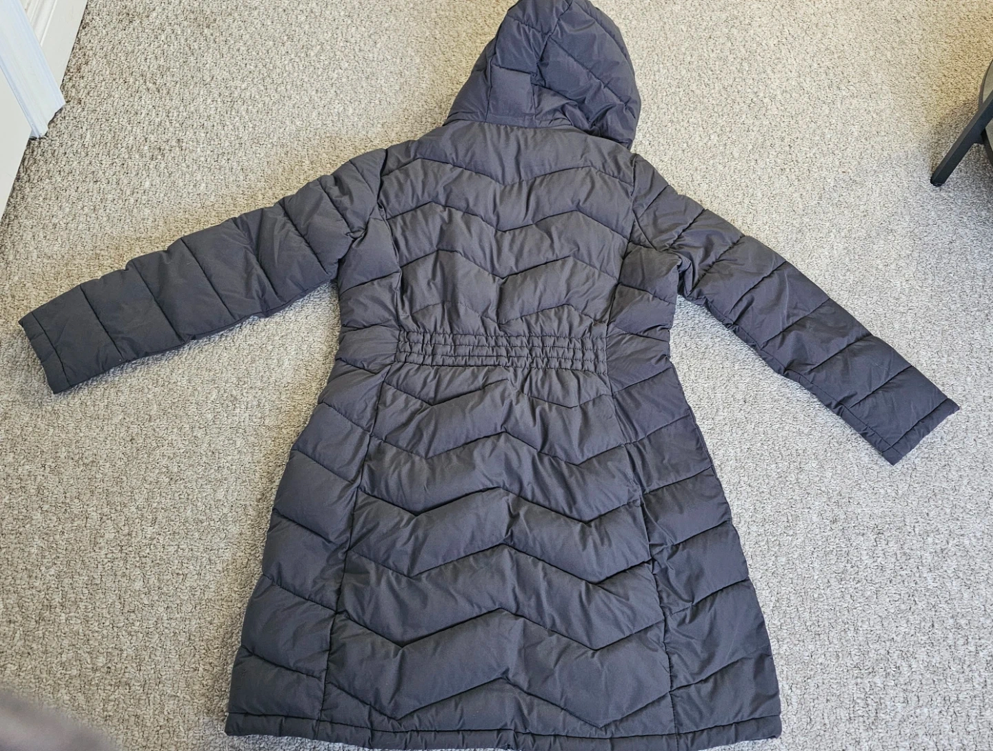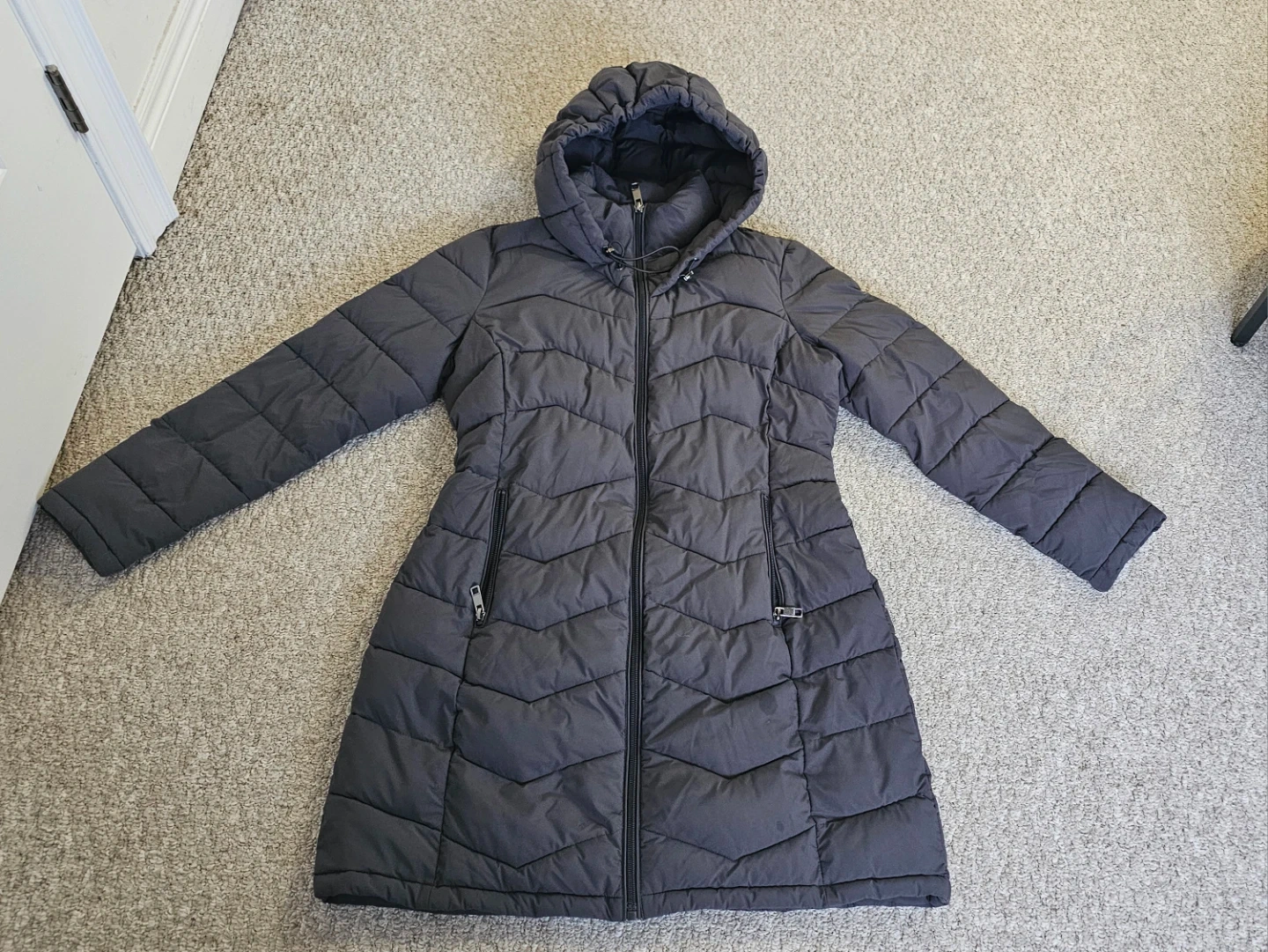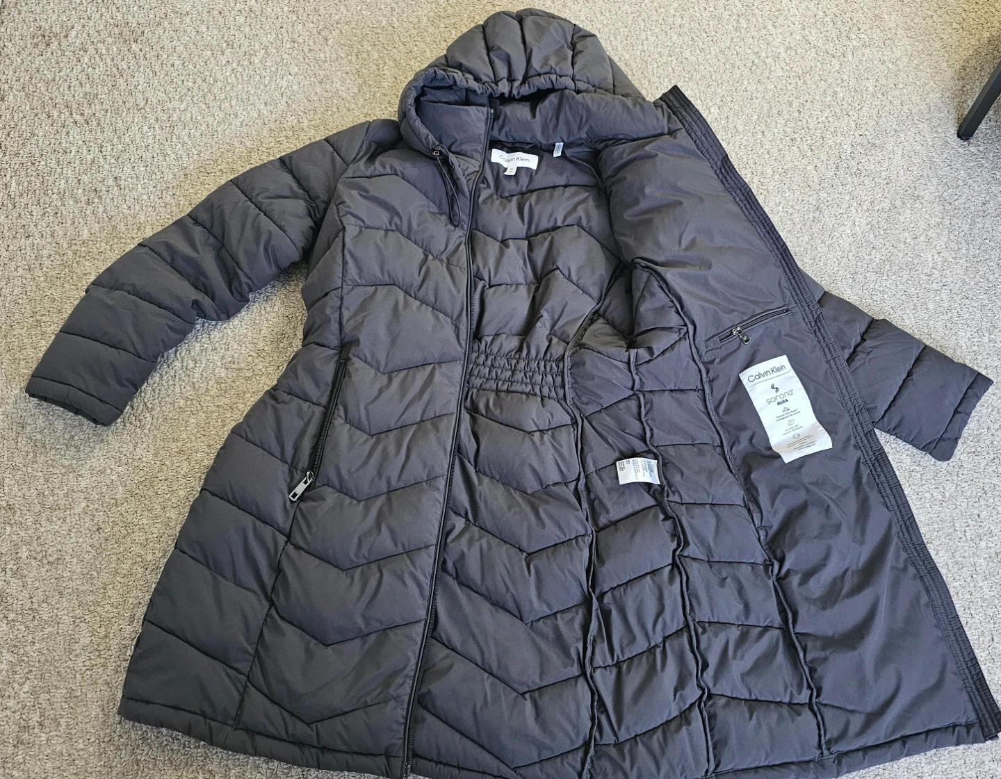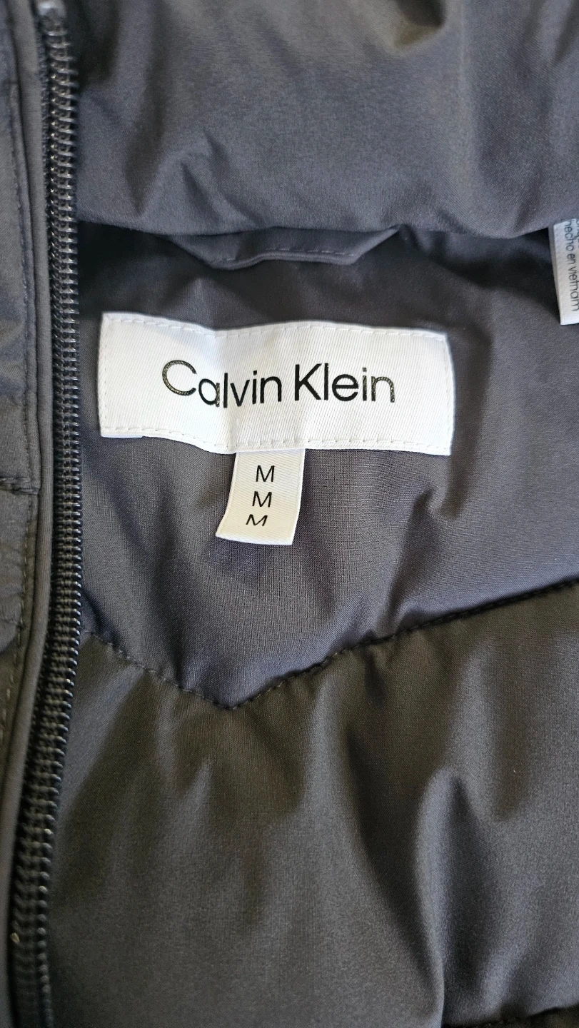 This is a Calvin Klein puffer coat in charcoal grey. It's a size medium with a drawstring waist. The hood is attached and it has zippered pockets. It's a great option for staying warm in cooler weather! 100% polyester