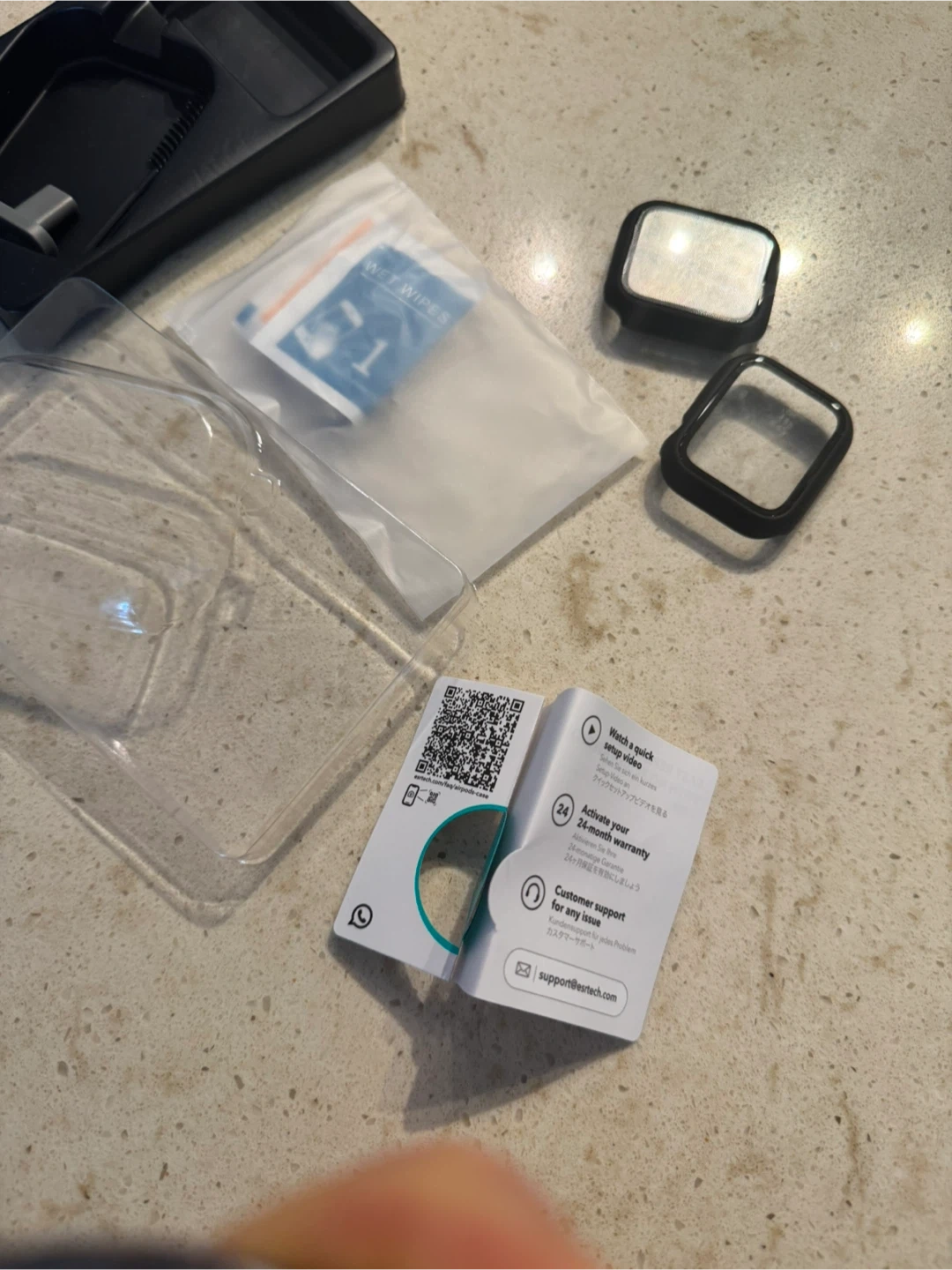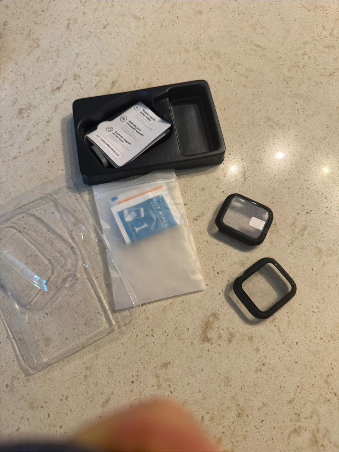 Includes two black protective cases with built-in screen protectors for Apple Watch. Also comes with wet wipes for cleaning. Protect your watch from scratches and bumps!