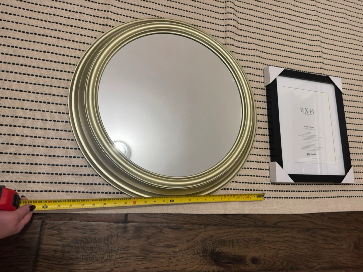 A decorative gold round wall mirror with a wide, fluted frame. It measures approximately 16 inches in diameter. Perfect for adding a touch of elegance to any room!