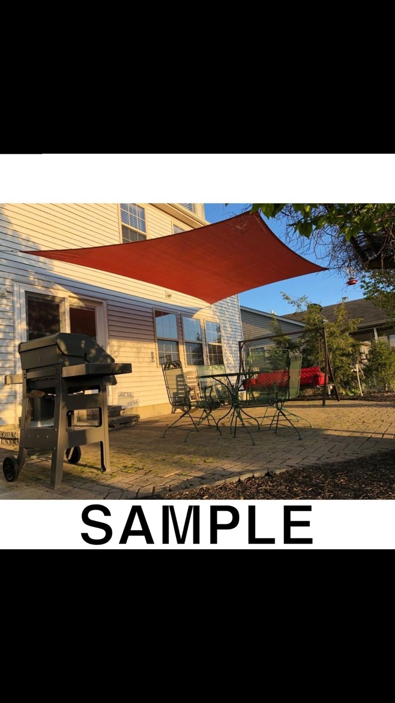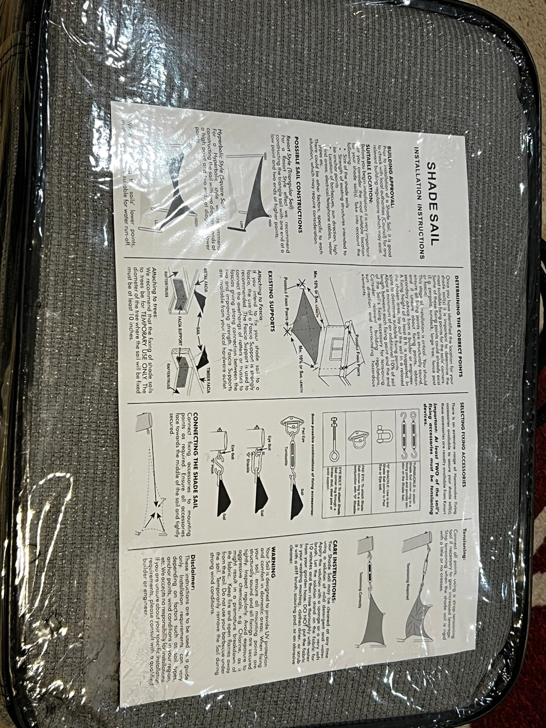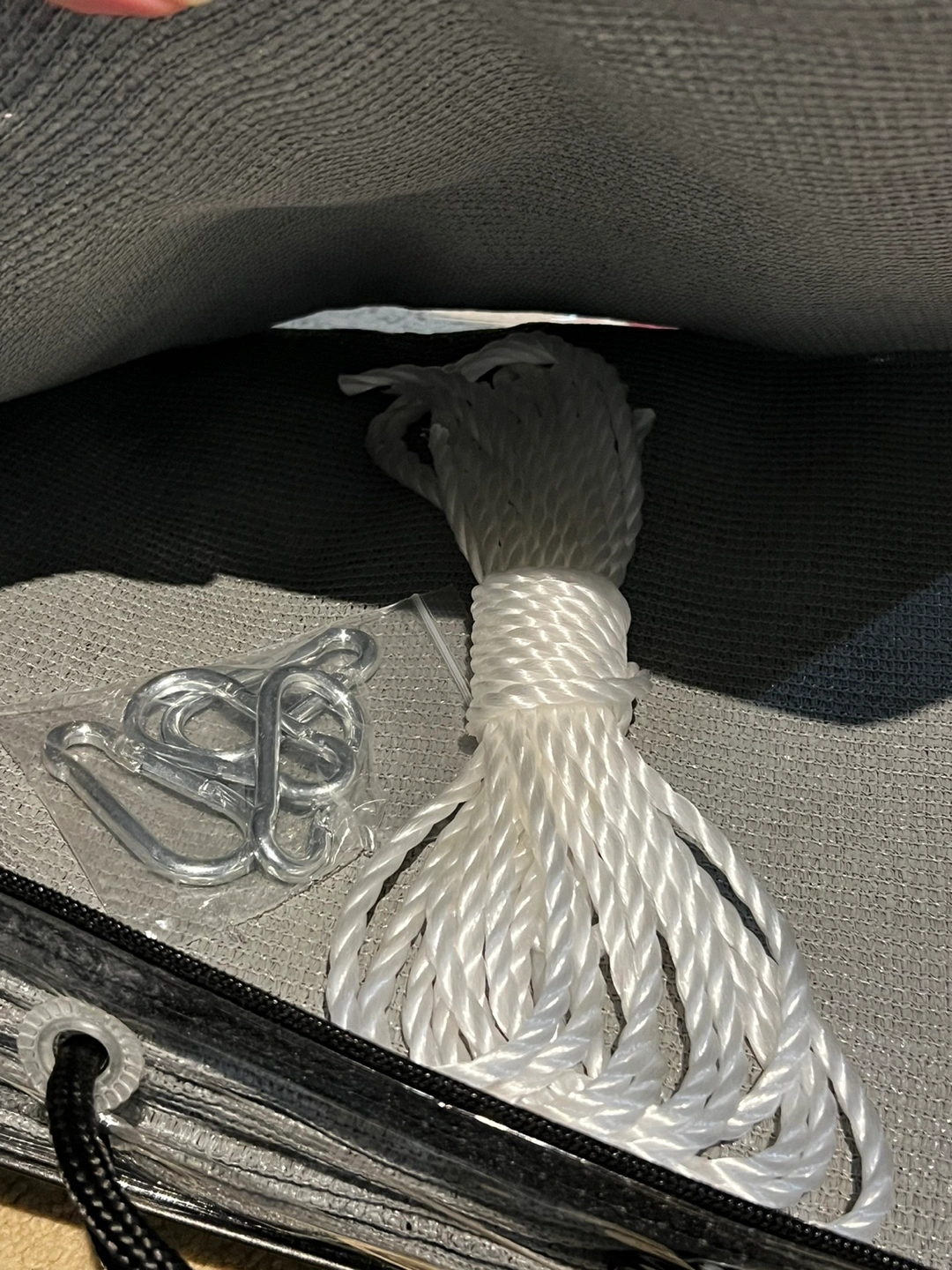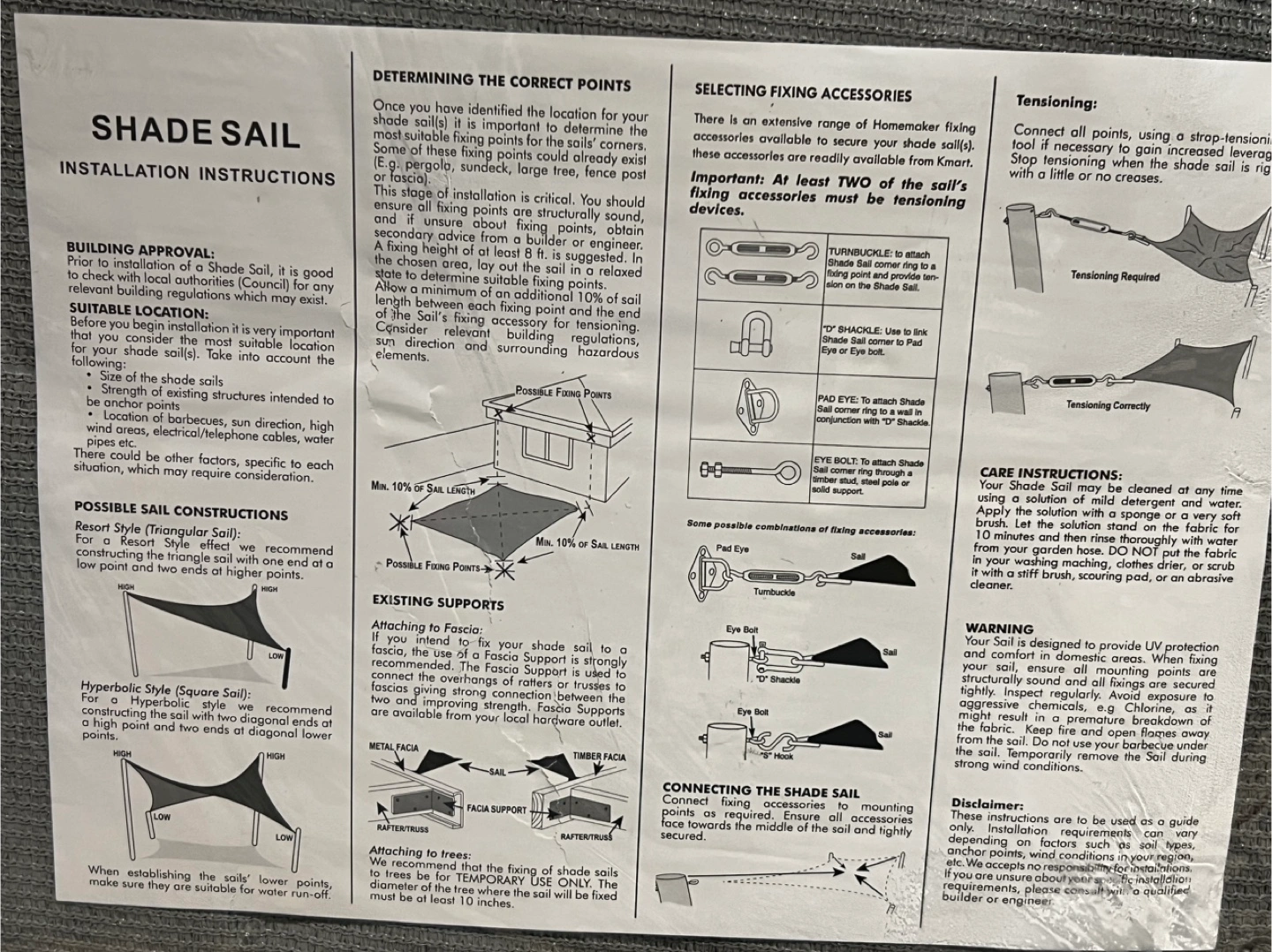 Selling a shade sail with installation instructions and accessories. The package includes ropes and hooks to help you set it up. It's designed to provide UV protection and can withstand strong wind conditions. Please refer to the installation instructions for suitable locations and proper setup