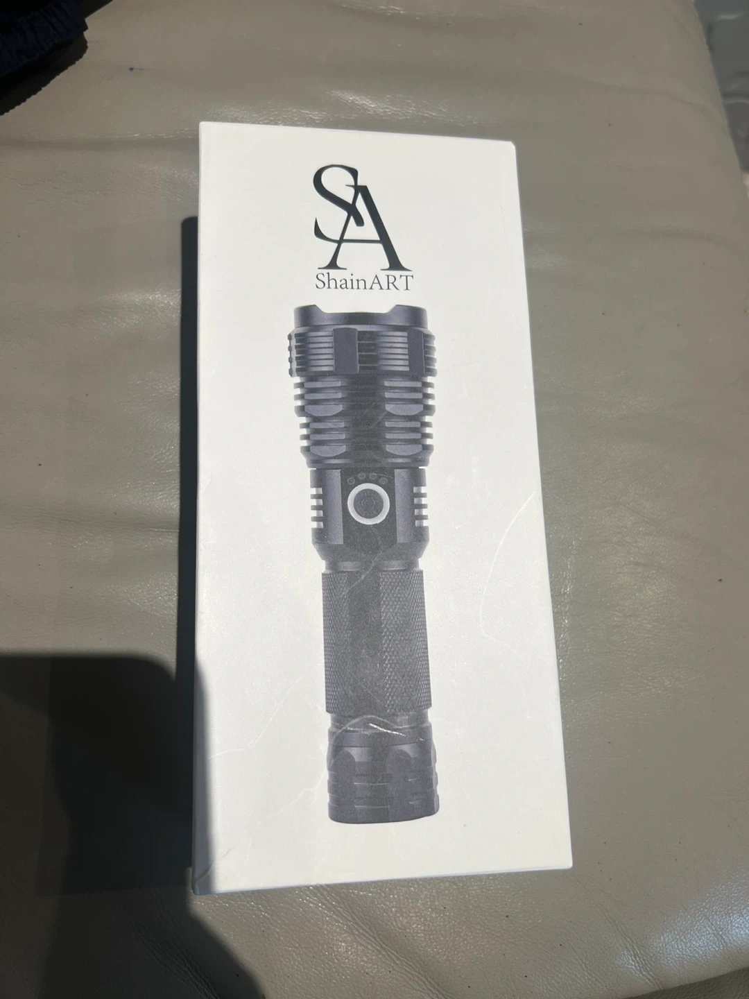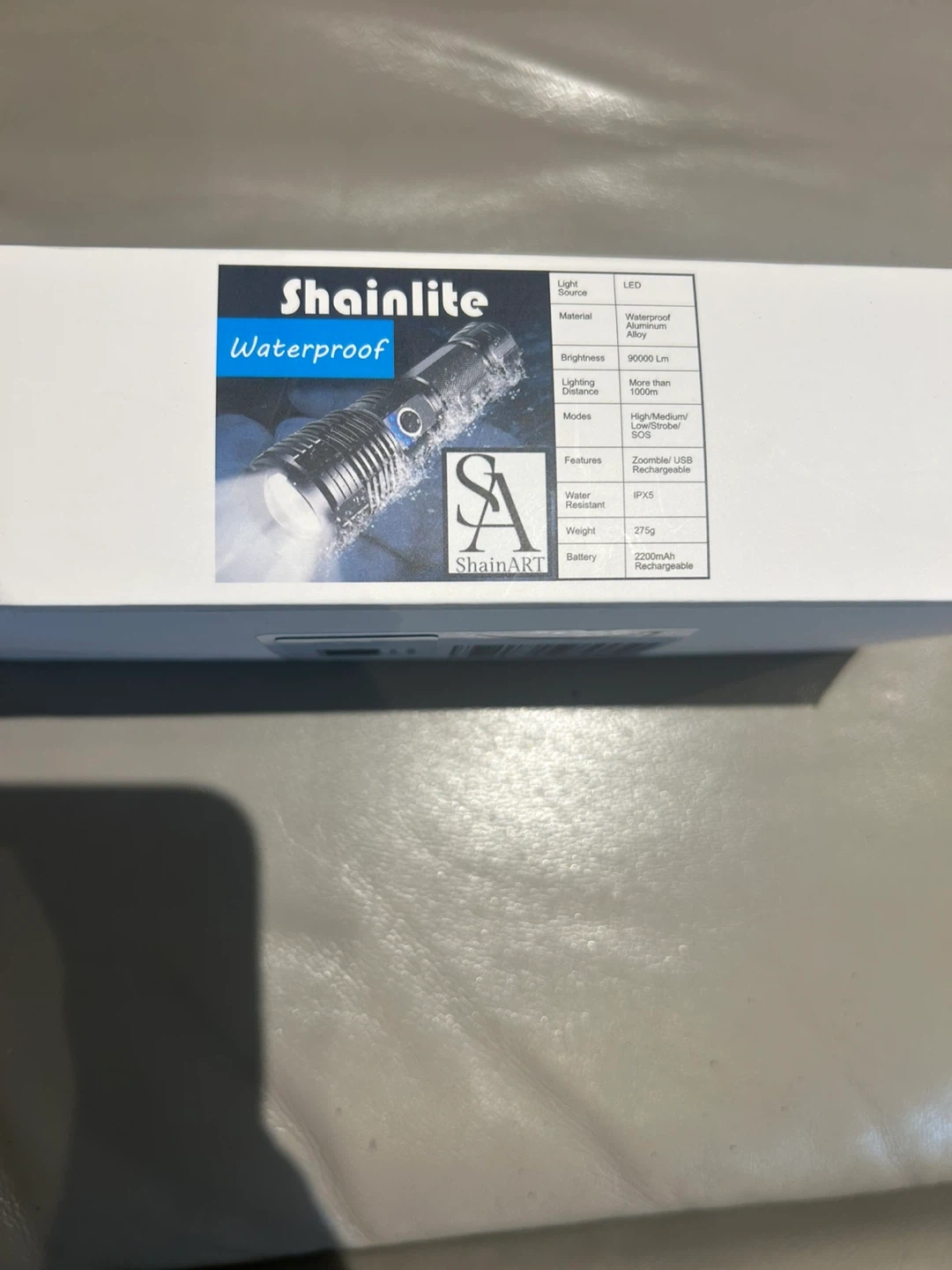 Selling a brand new ShainArt LED flashlight, still in its original packaging! This flashlight is waterproof and made with durable aluminum. It has a brightness of 90000 Lm and features multiple modes including high, medium, strobe, and SOS. It's also zoomable and USB rechargeable. Super handy for camping or emergencies!
