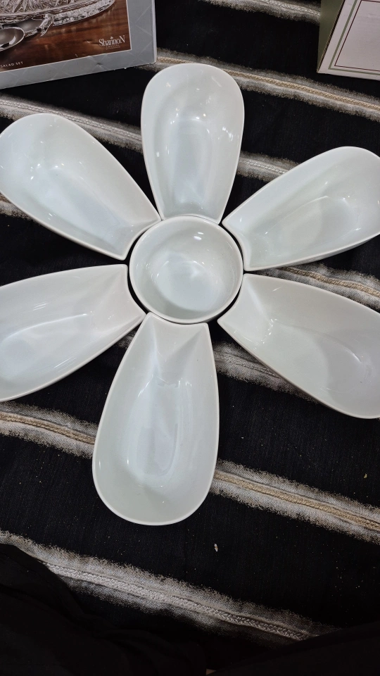 13Selling a Shannon N spread set! It features a unique floral design with six petal-shaped bowls surrounding a central bowl, perfect for serving appetizers or dips. The set is in great condition and ready to add a touch of elegance to your table