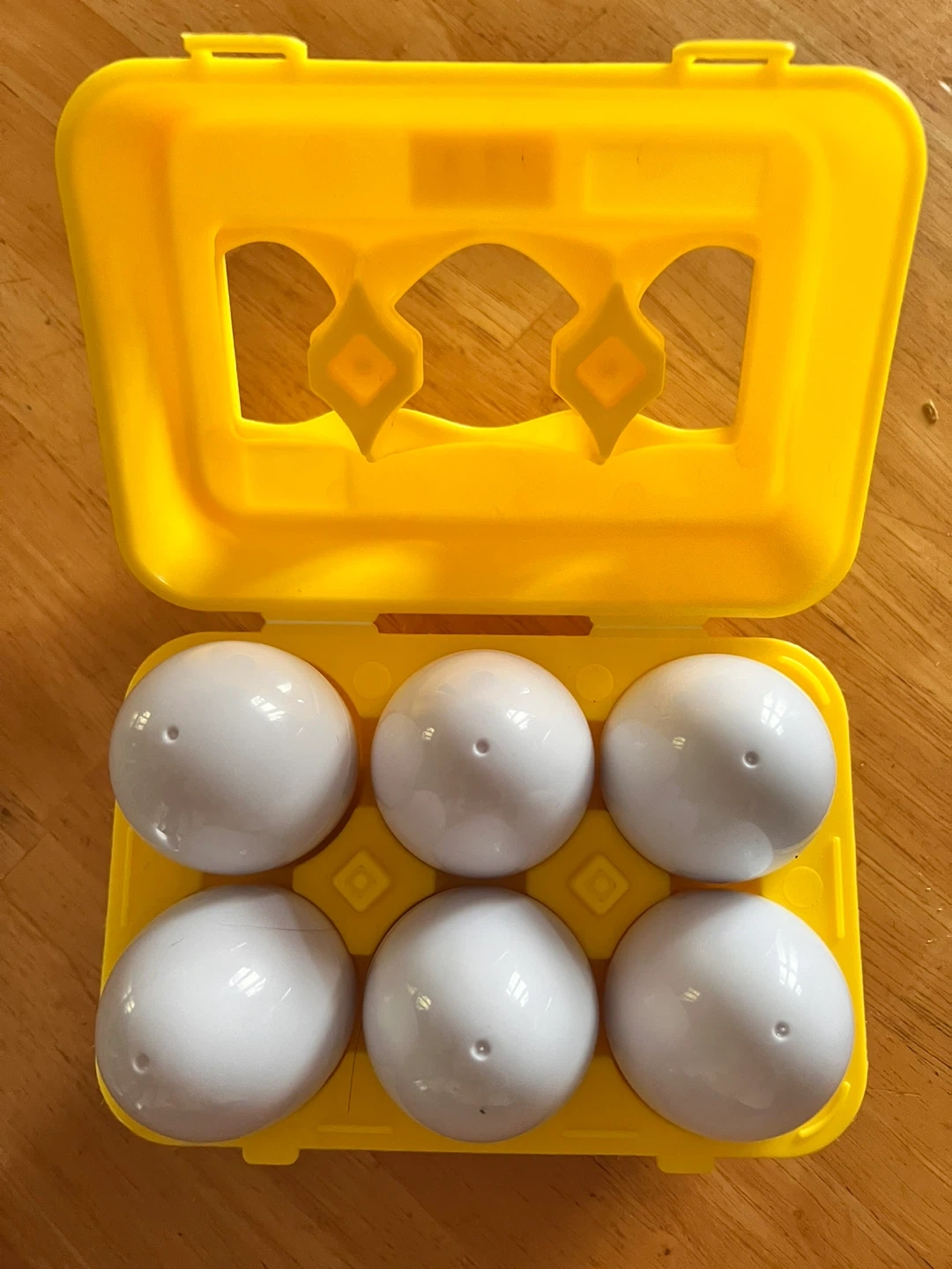 This is a fun shape sorting toy that comes in an egg carton design! It includes various shapes and colours to help your little one develop their fine motor skills and problem-solving abilities. The toy is in great condition and ready for a new home!