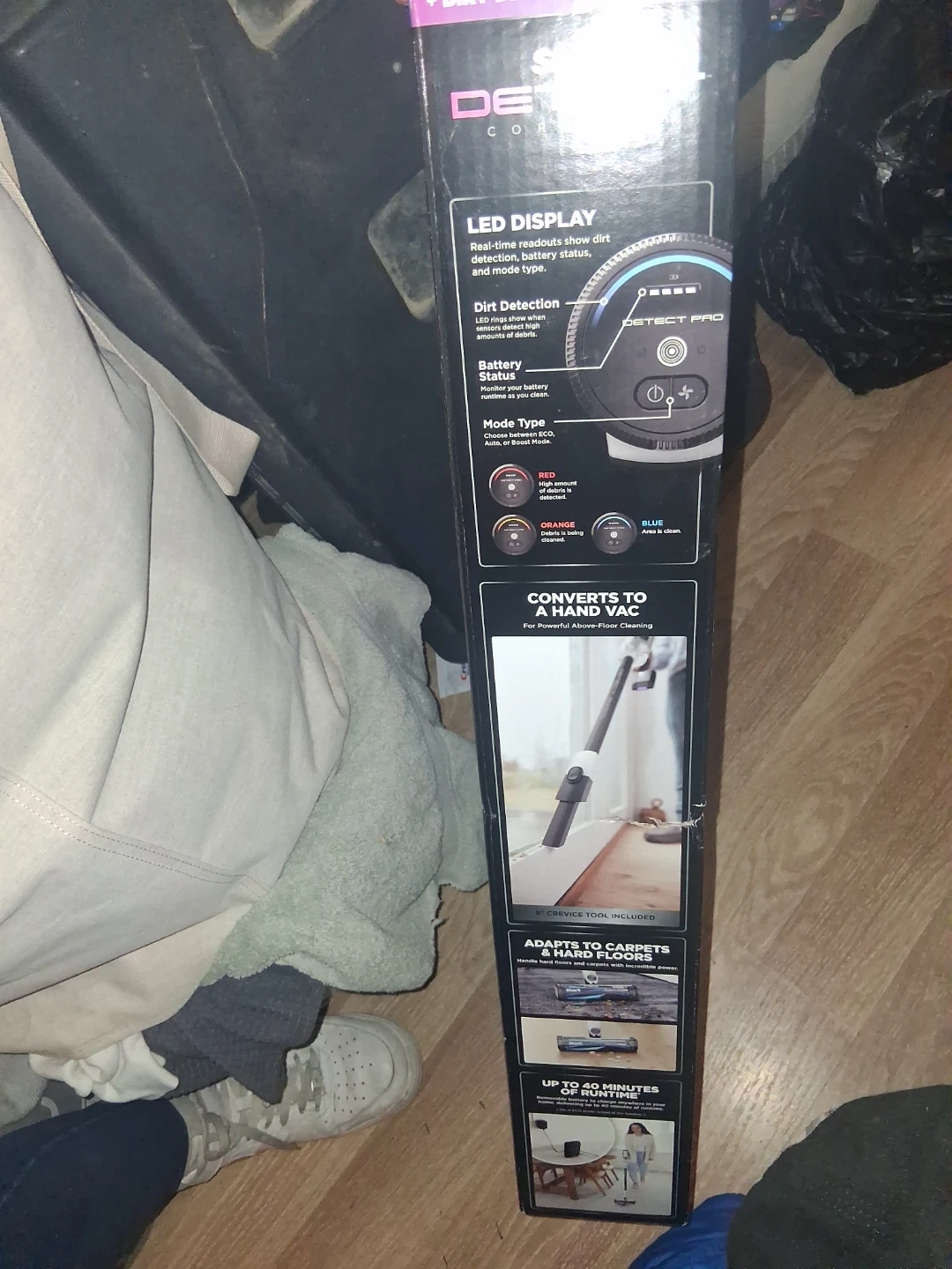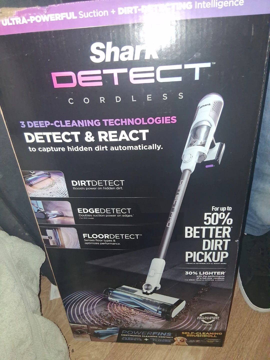 43Selling a Shark Detect Cordless vacuum cleaner. It features 3 deep-cleaning technologies to detect and react to capture hidden dirt automatically. The vacuum has DirtDetect, EdgeDetect, and FloorDetect. It has up to 50% better dirt pickup and is 30% lighter. Converts to a hand vac for powerful above-floor cleaning. Adapts to carpets and hard floors. Brand new still in original packaging