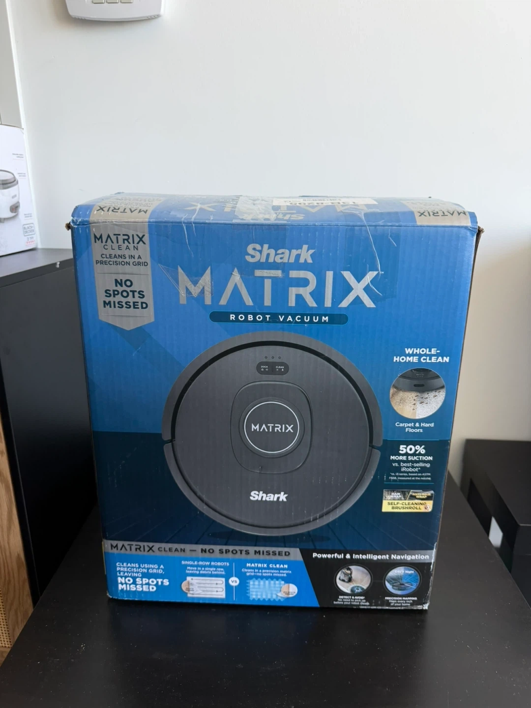 Selling a Shark Matrix Robot Vacuum (model RV2300/UR2300, like new in box) - Powerful suction for both carpets and hard floors - Precision Home Mapping with LiDAR navigation - Multi-surface brush roll for pet hair and debris - Matrix Clean: cleans with a precision grid for deep coverage - Smart features: App control, targeted room cleaning, auto recharge - All original accessories and packaging included (see photos) Condition: Open box, never used. All accessories, paperwork, and packaging included. Retail:Sells new for $250 CAD + tax at major retailers