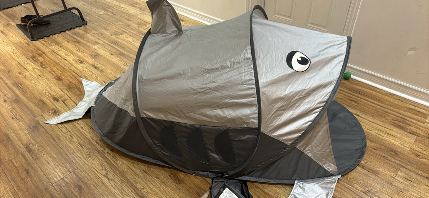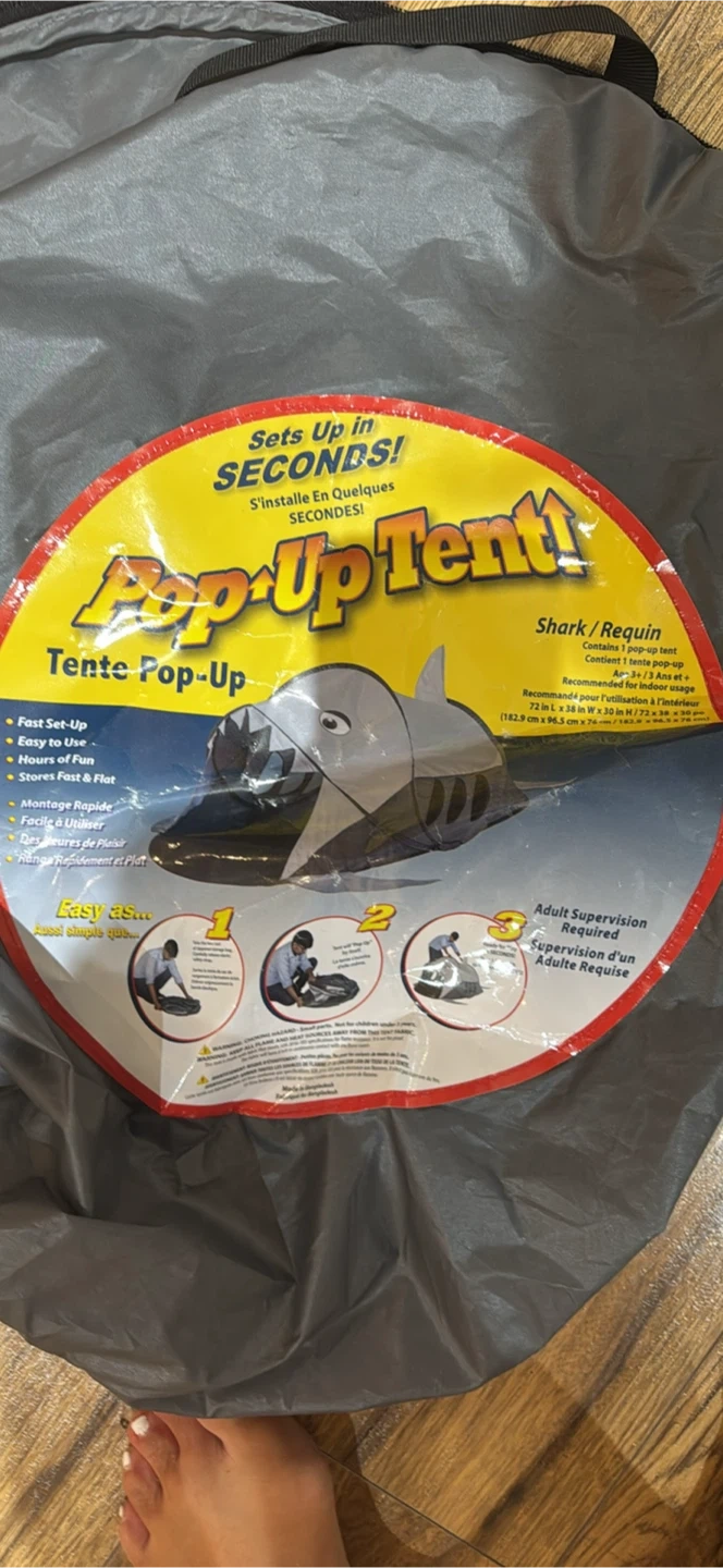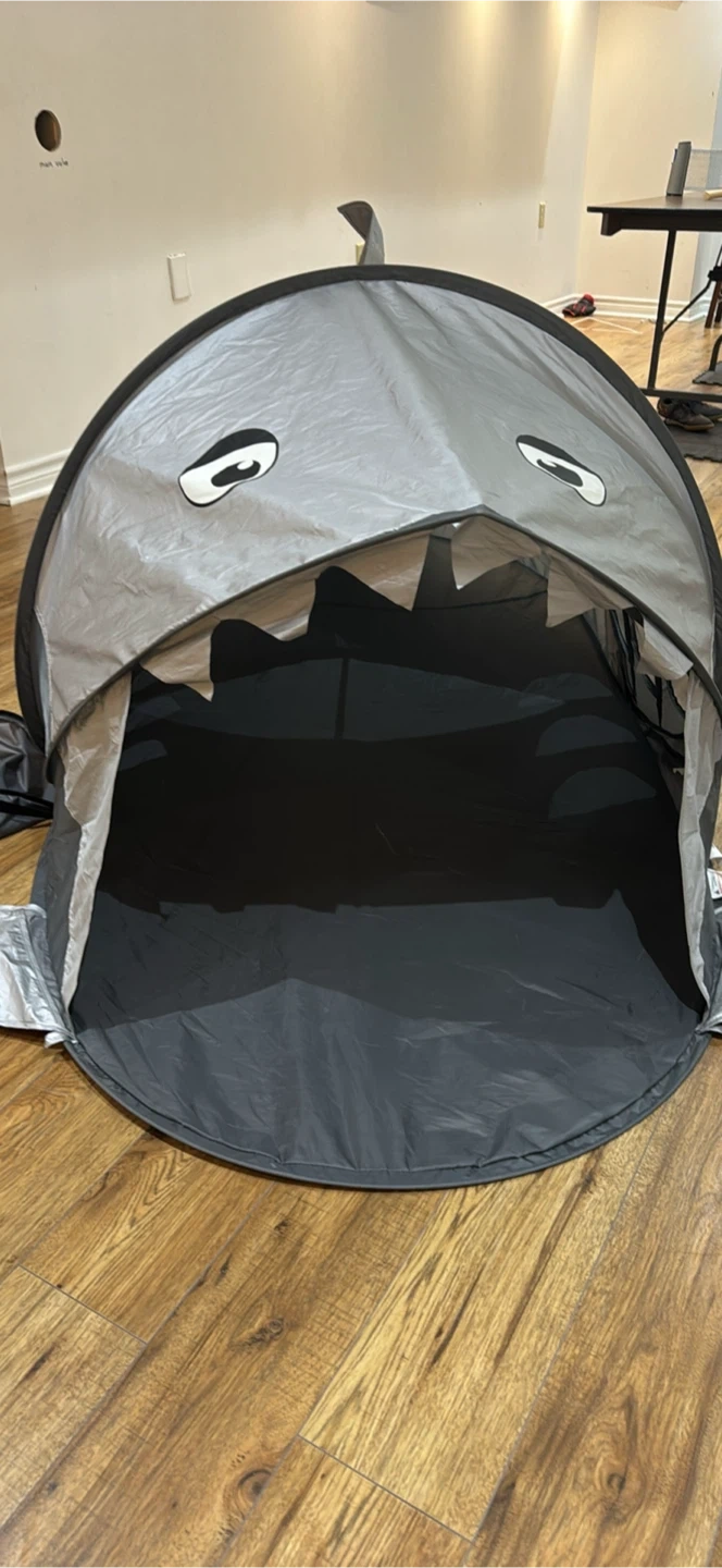 This adorable shark-shaped pop-up tent is perfect for kids! It sets up in seconds and provides hours of fun. It's easy to use and folds flat for storage. Adult supervision is required. Ready for a new home!