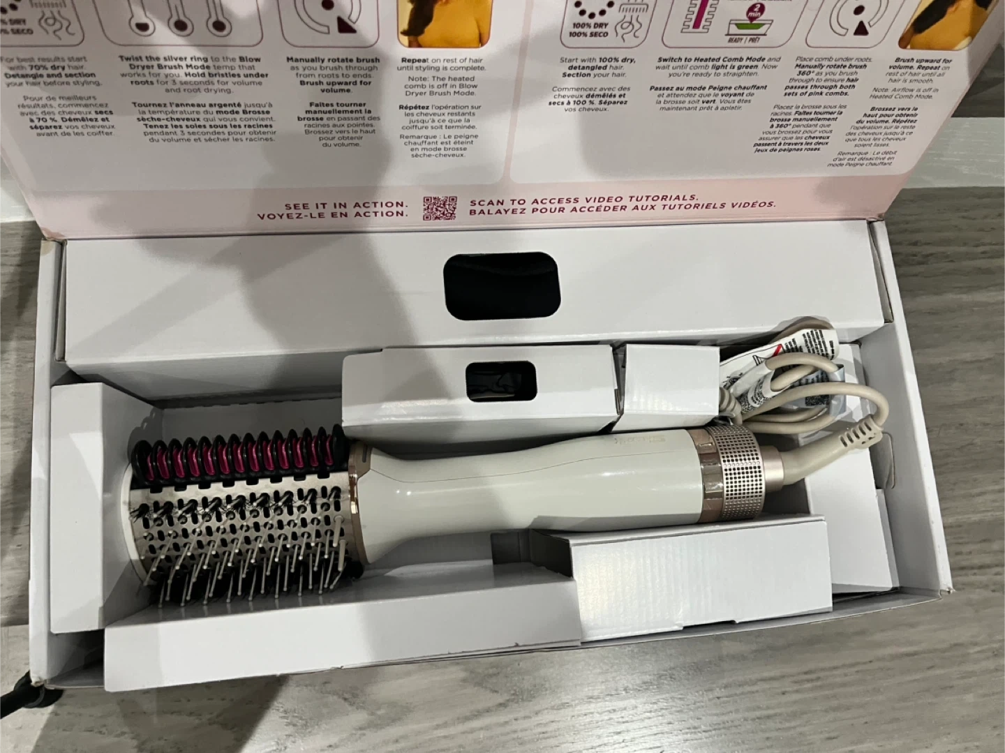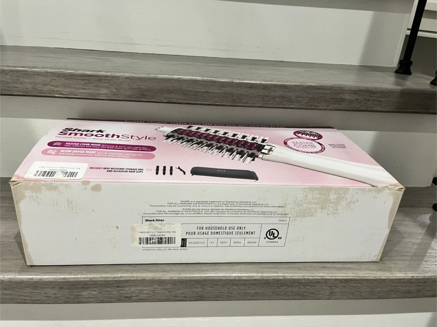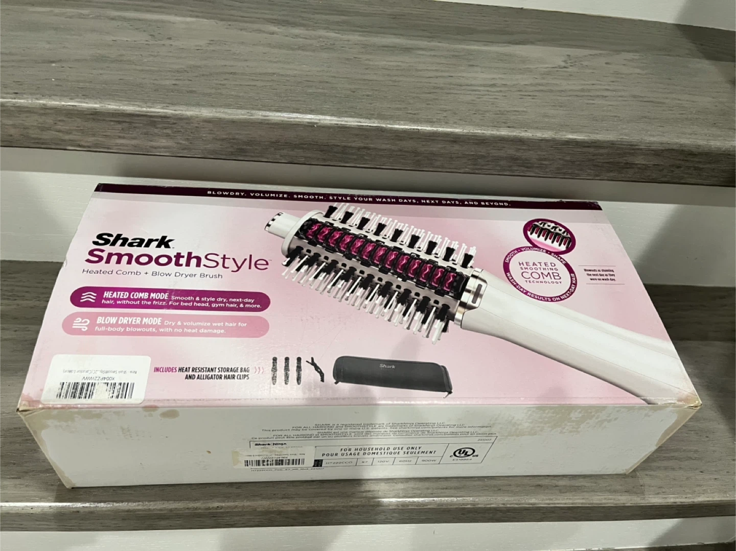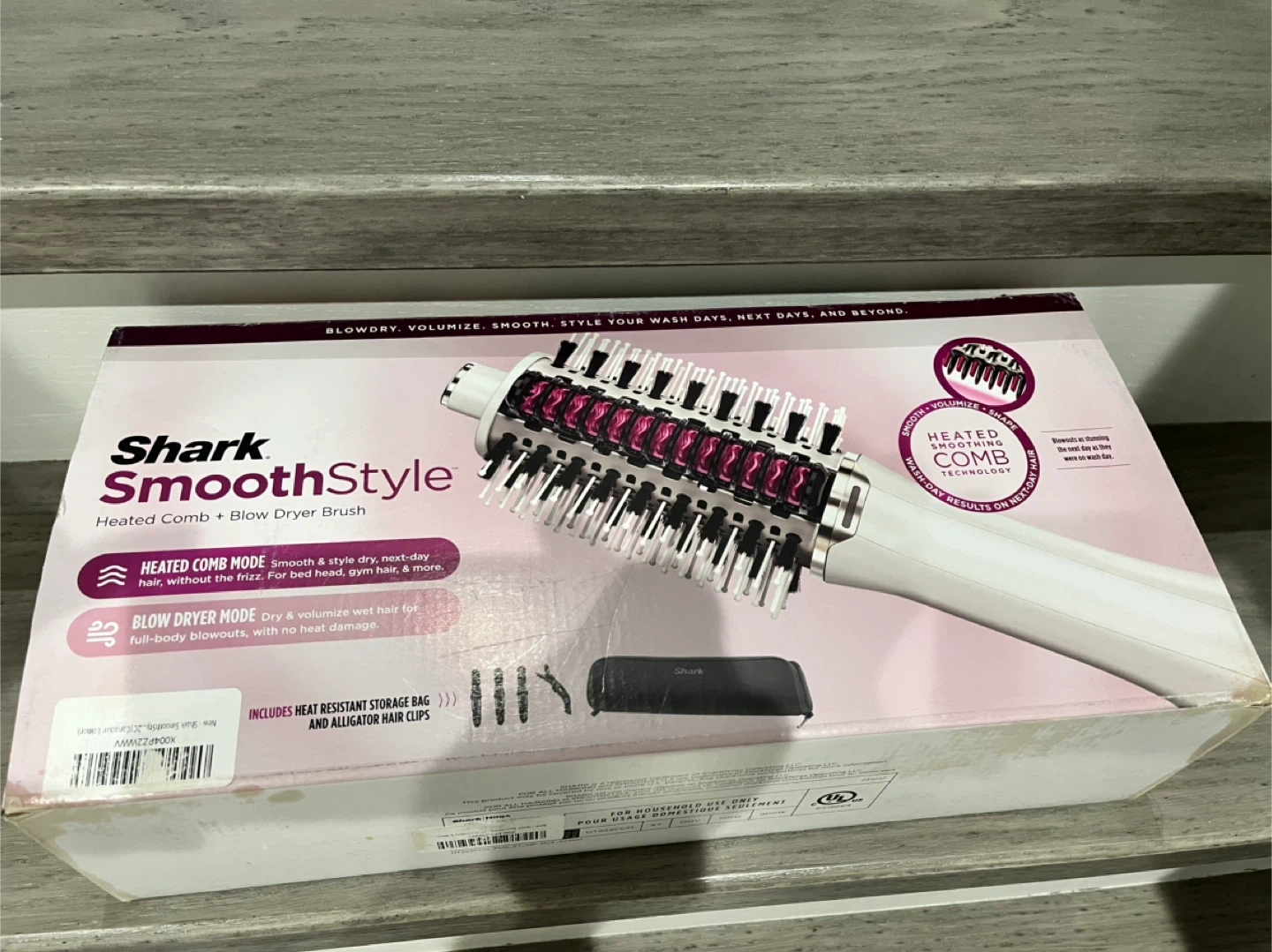 Selling a Shark SmoothStyle Heated Comb + Blow Dryer Brush. It's a heated comb mode that smooths and styles dry, next-day hair without the frizz. Also has a blow dryer mode to dry & volumize wet hair for full-body blowouts, with no heat damage. Includes a heat resistant storage bag and alligator hair clips. The box is included! It used for once.