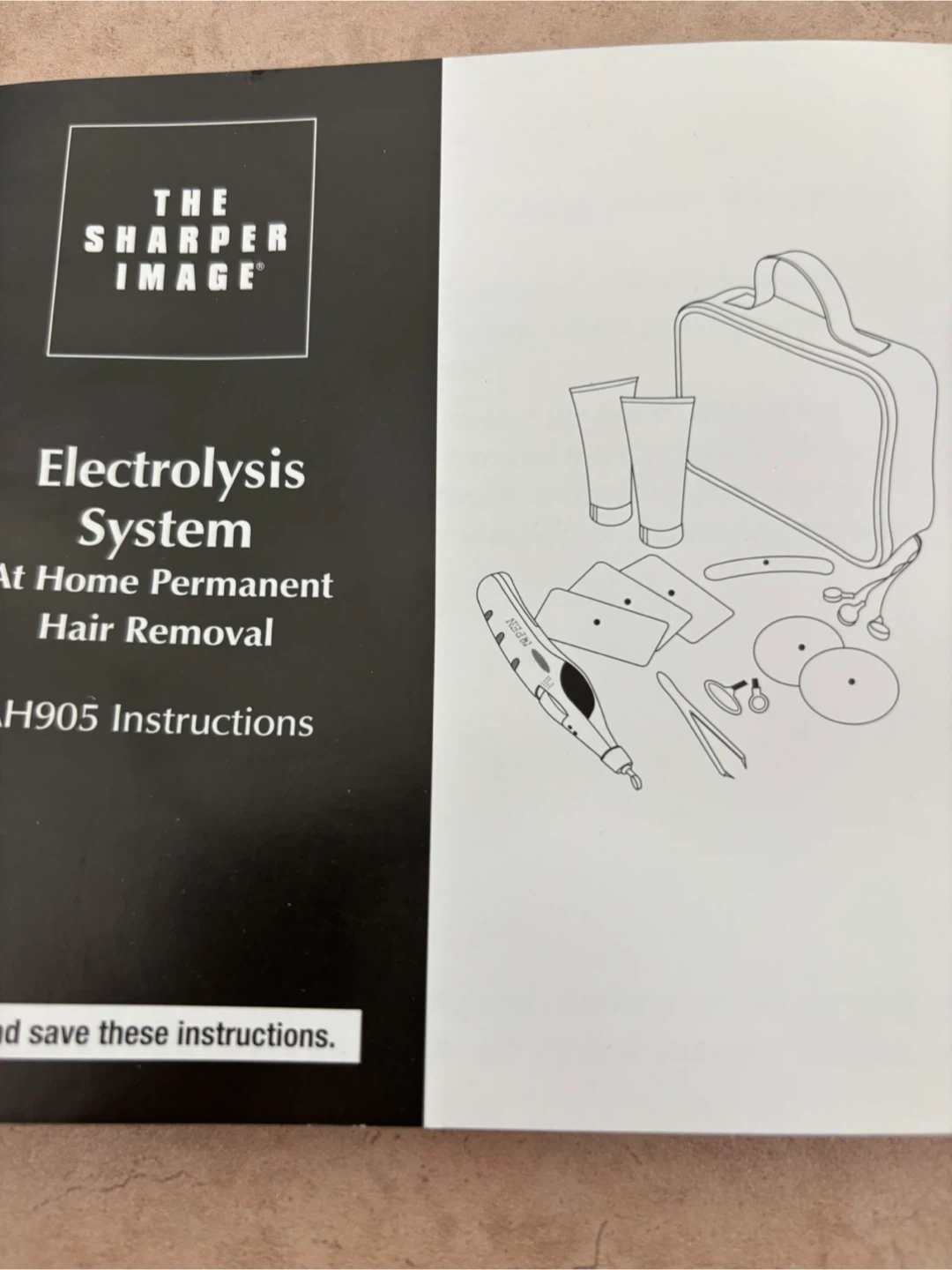I'm selling a Sharper Image Electrolysis System for at-home permanent hair removal. It comes with the electrolysis pen, conductive gel, pre-epilation cleansing gel, and accessories, all neatly packed in its original case. Also included is the instruction manual to guide you through the process Brand new never out of box. If