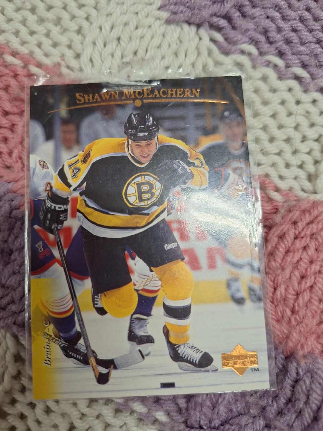 Selling a Shawn McEachern hockey card featuring him in his Bruins uniform! It's an Upper Deck card, perfect for any hockey fan or collector